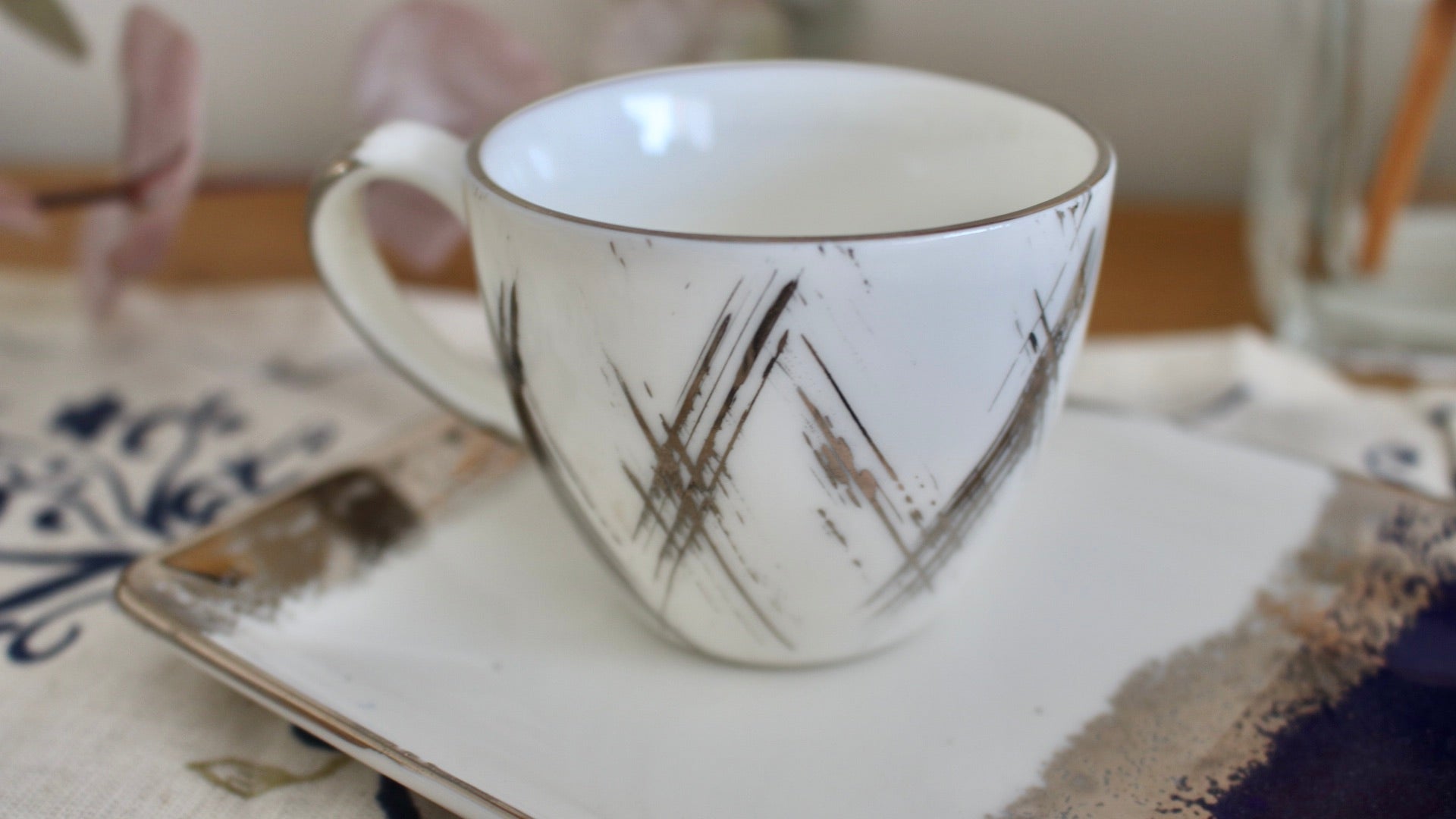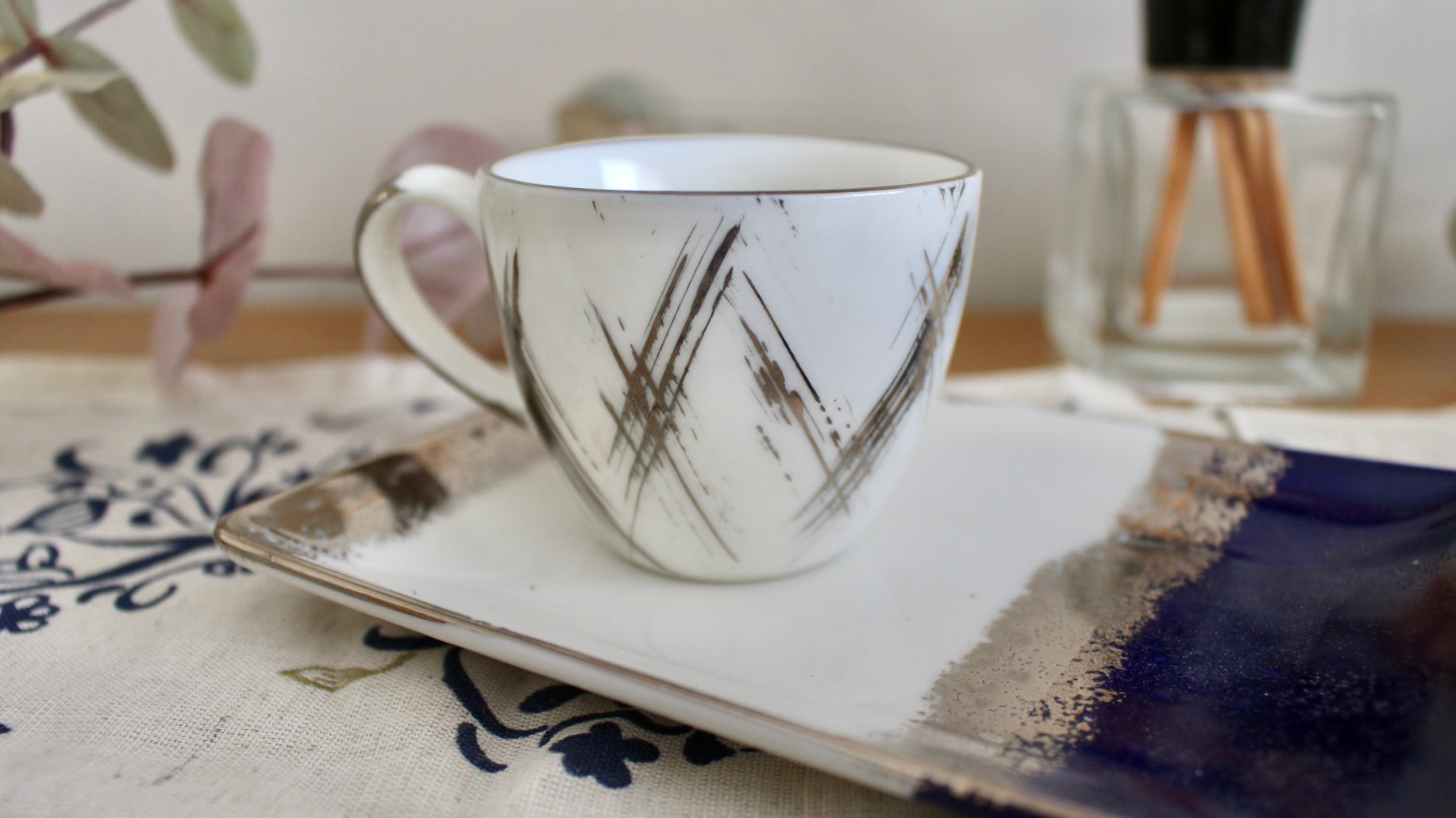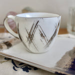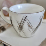 A little platinum goes a long way with the dainty Alfa coffee cup, a coffee corner staple. This is pure platinum hand painted on porcelain.