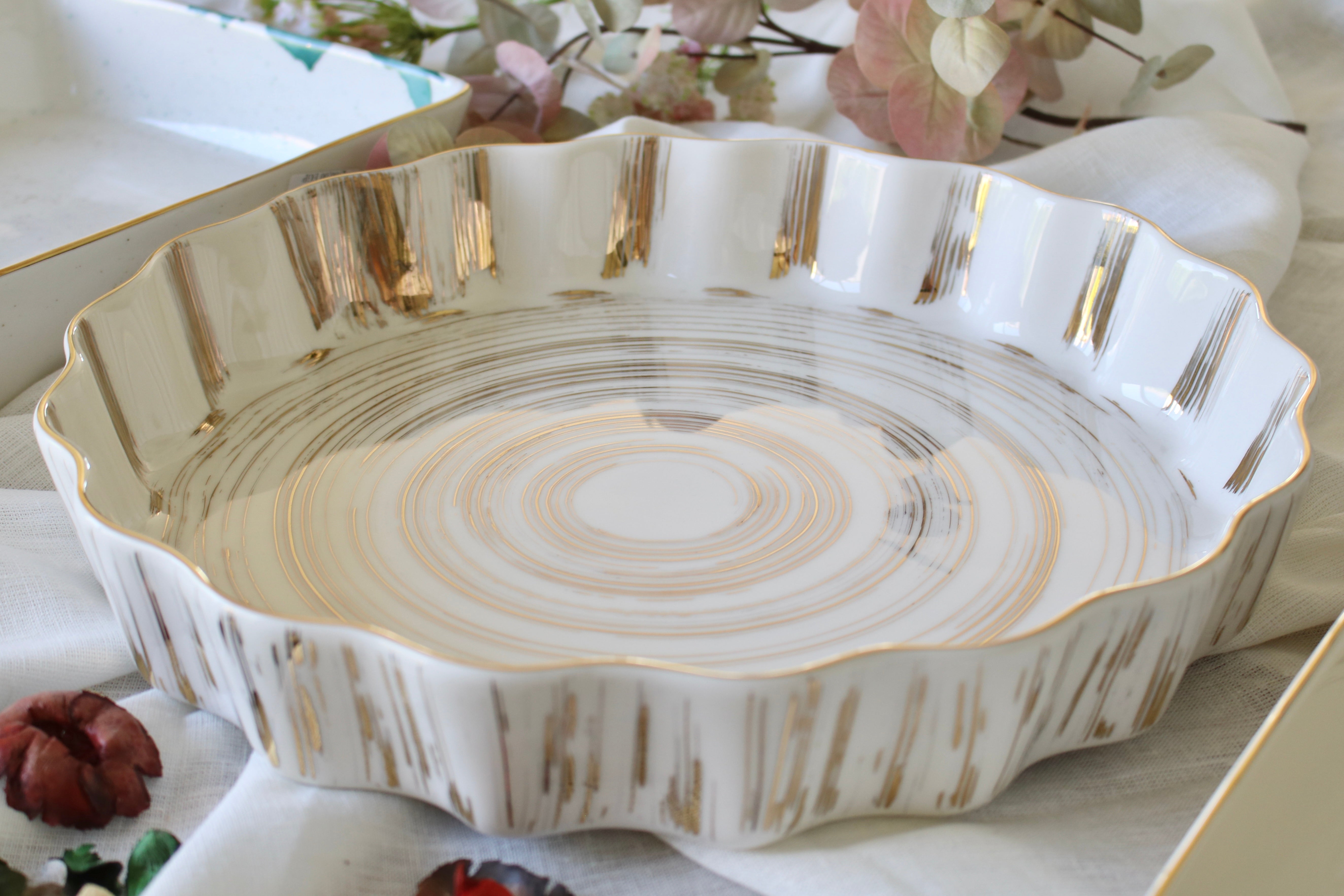 An oven safe baking dish that smoothly transitions from oven to tabletop! This is pure gold hand painted on porcelain. This baking dish is non-microwaveable but is dishwasher safe for up to 500 cycles. It is also oven safe.