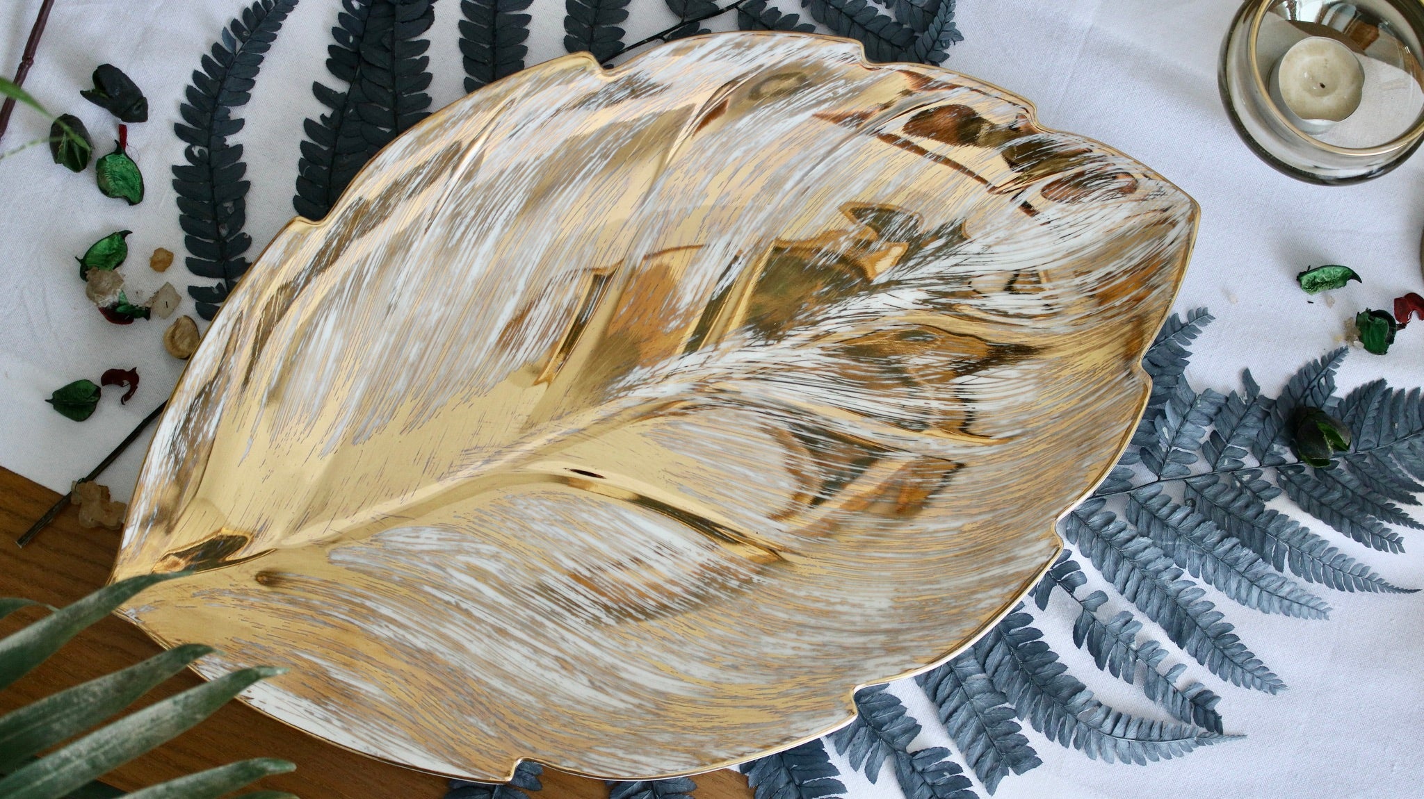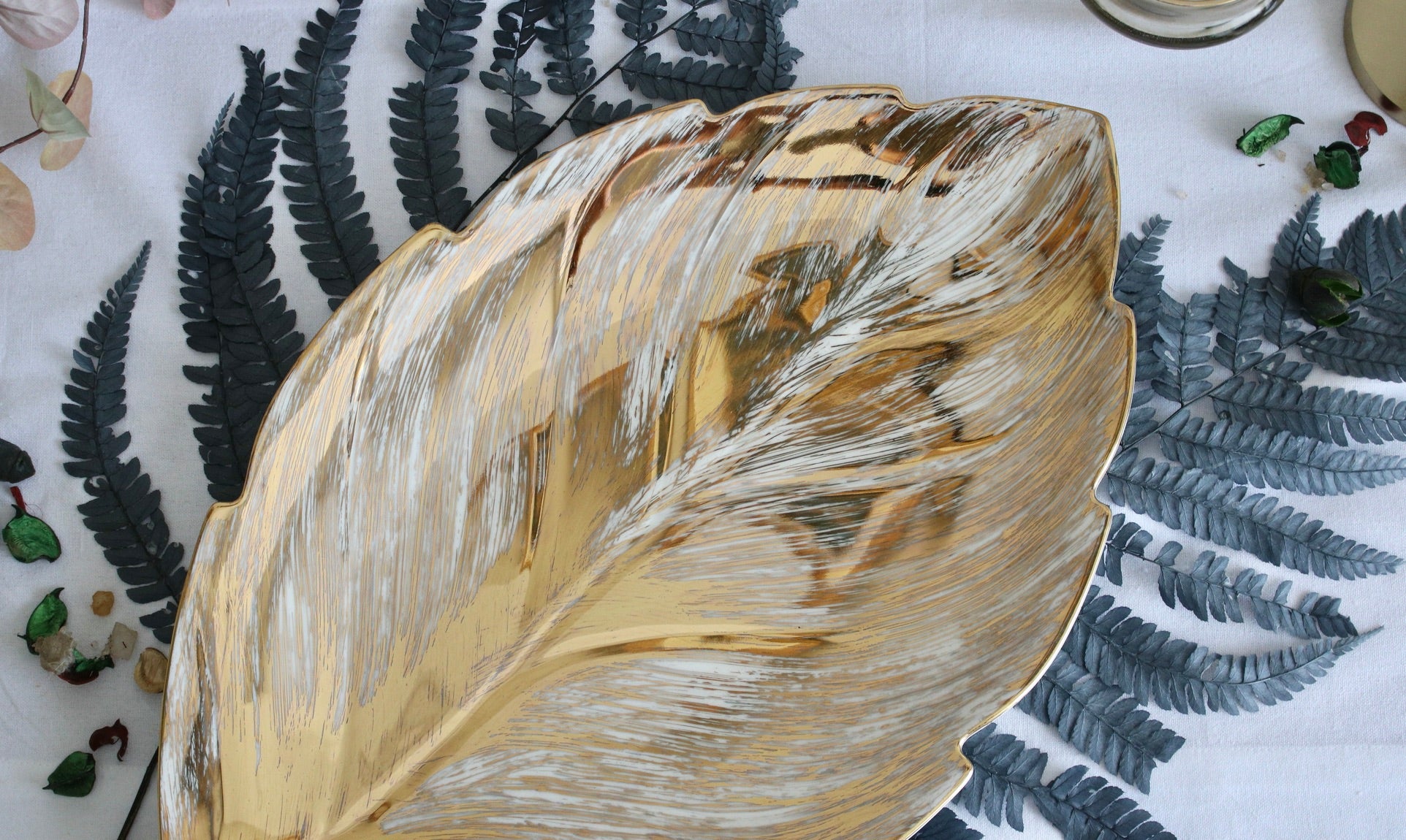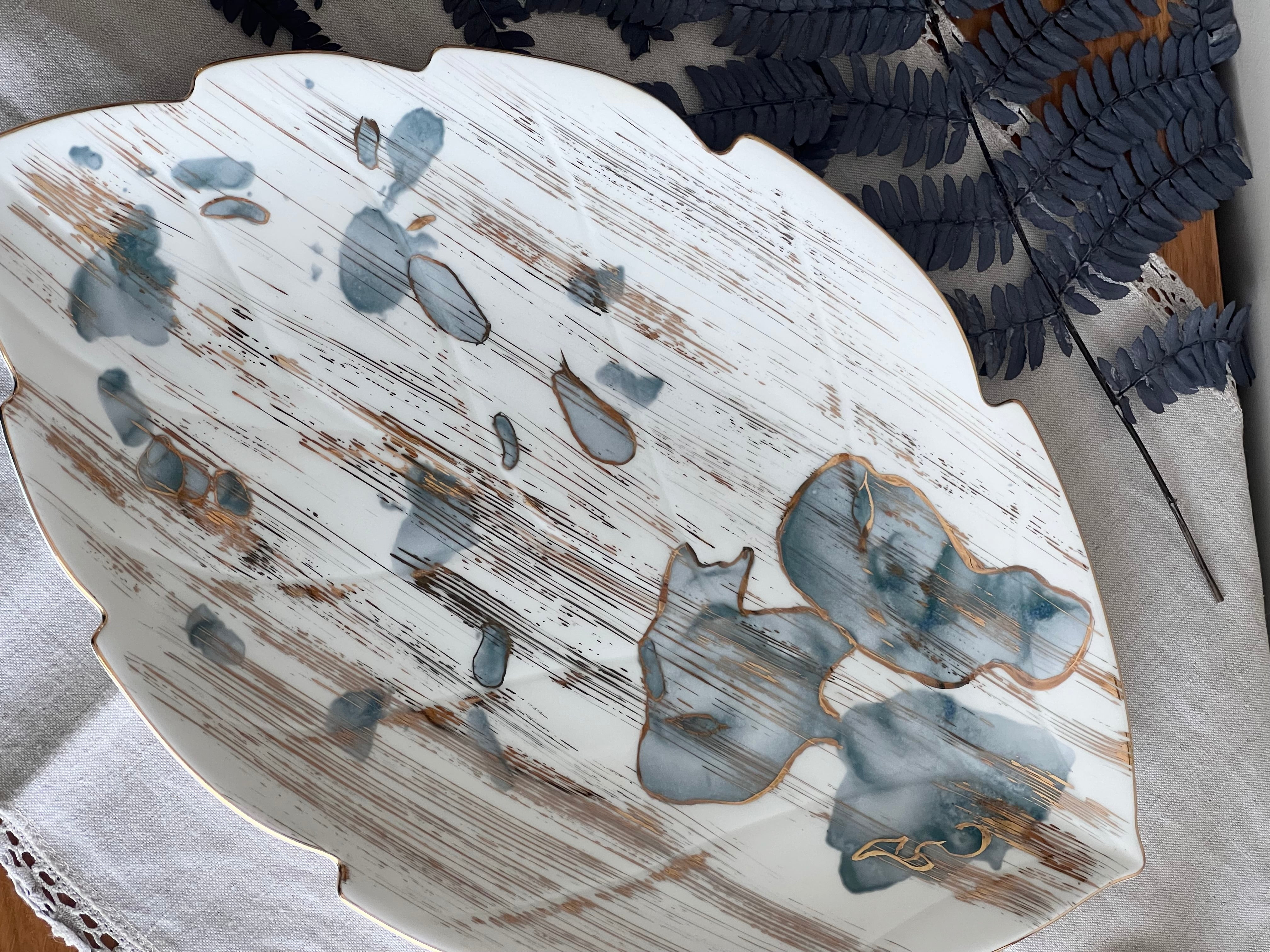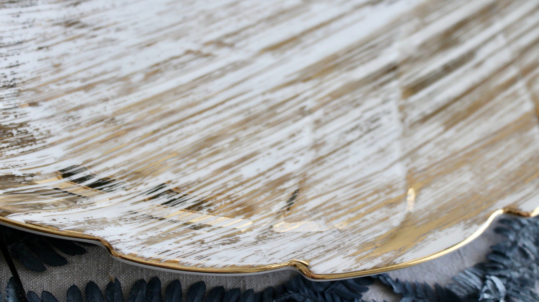 A 48 centimeter platter that draws inspiration from the flora around us. This is gold hand painted on porcelain.
