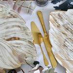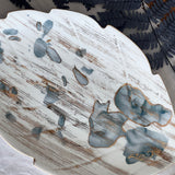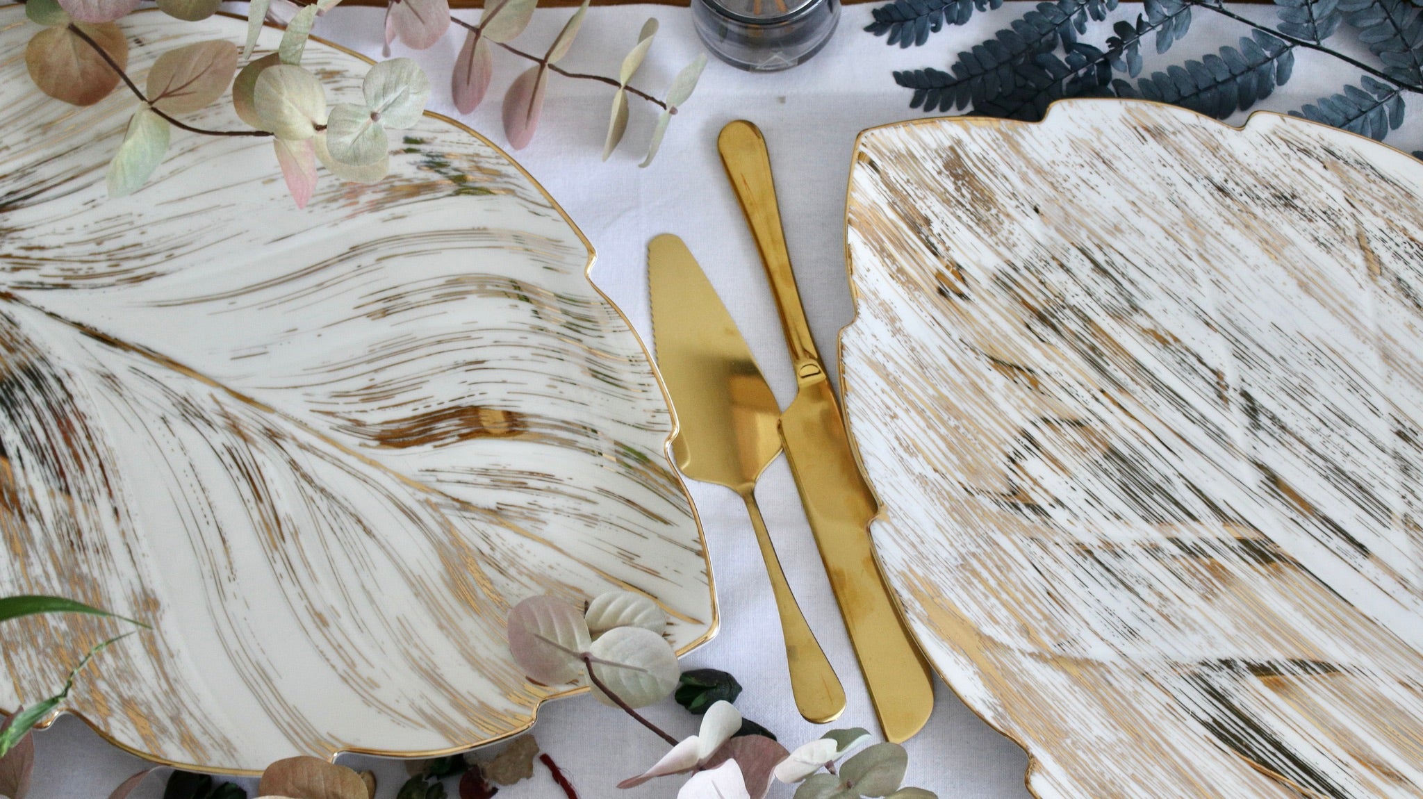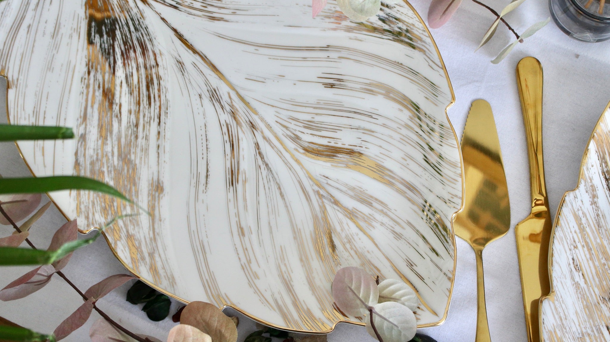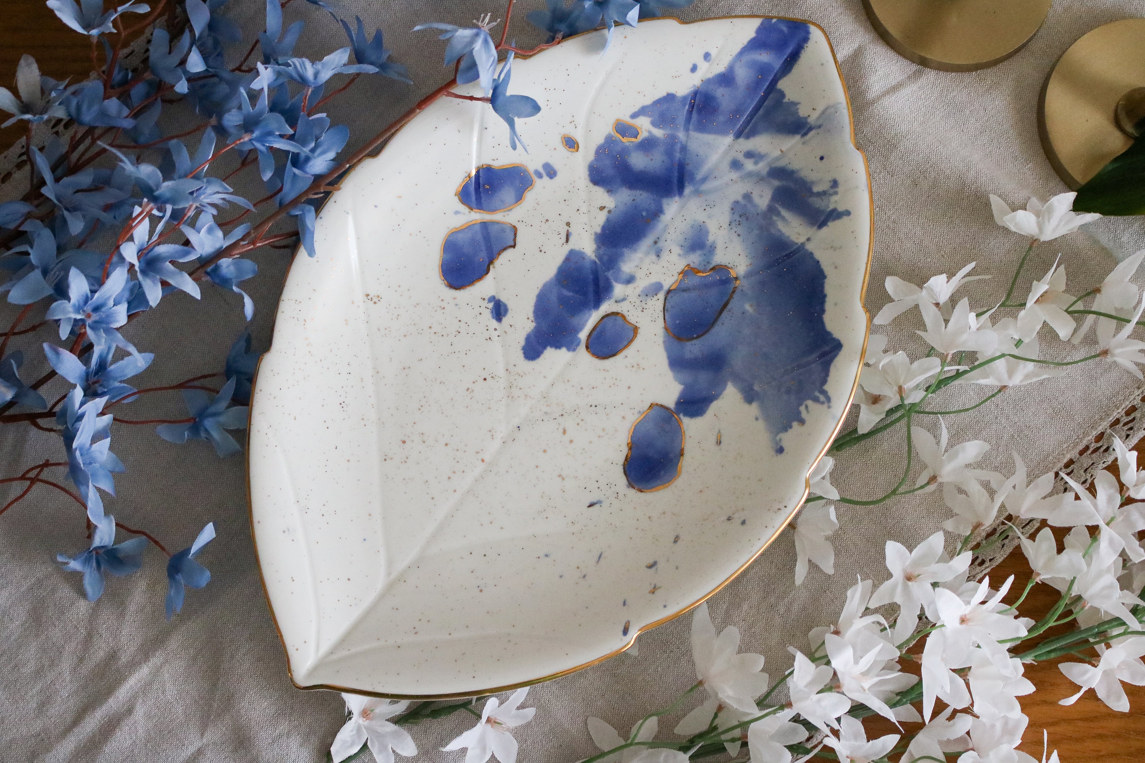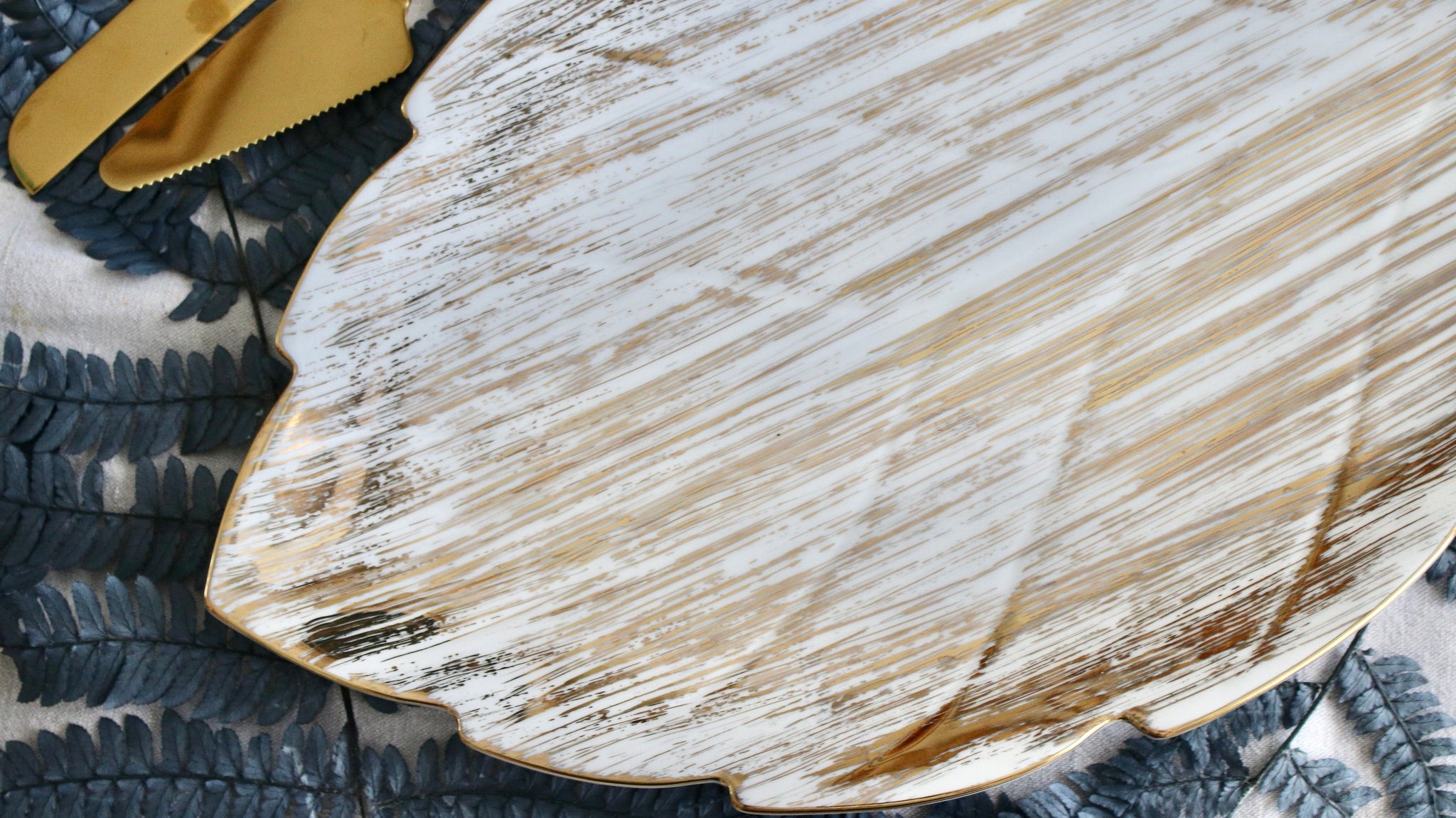 A 48 centimeter platter that draws inspiration from the flora around us. This is gold hand painted on porcelain.