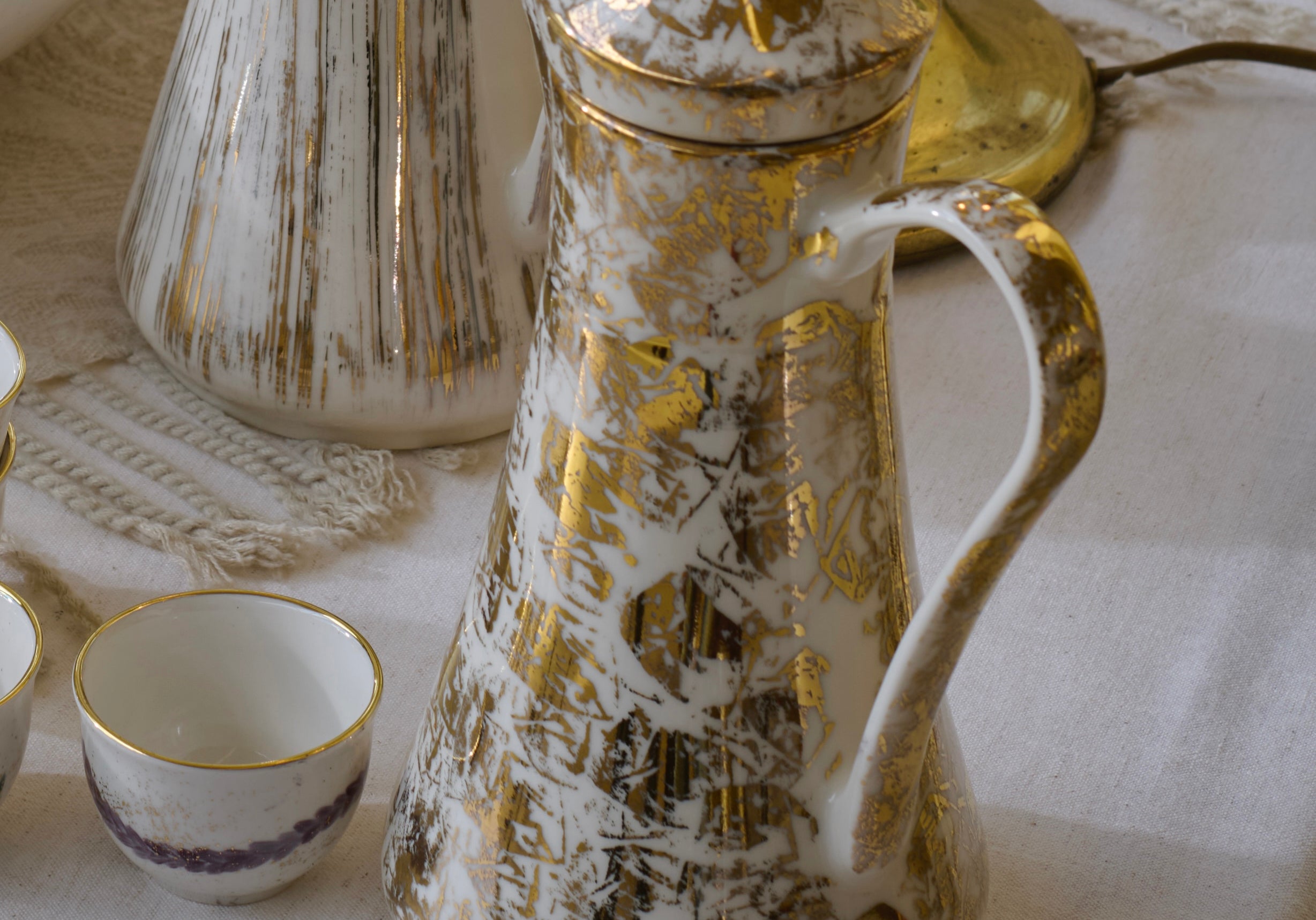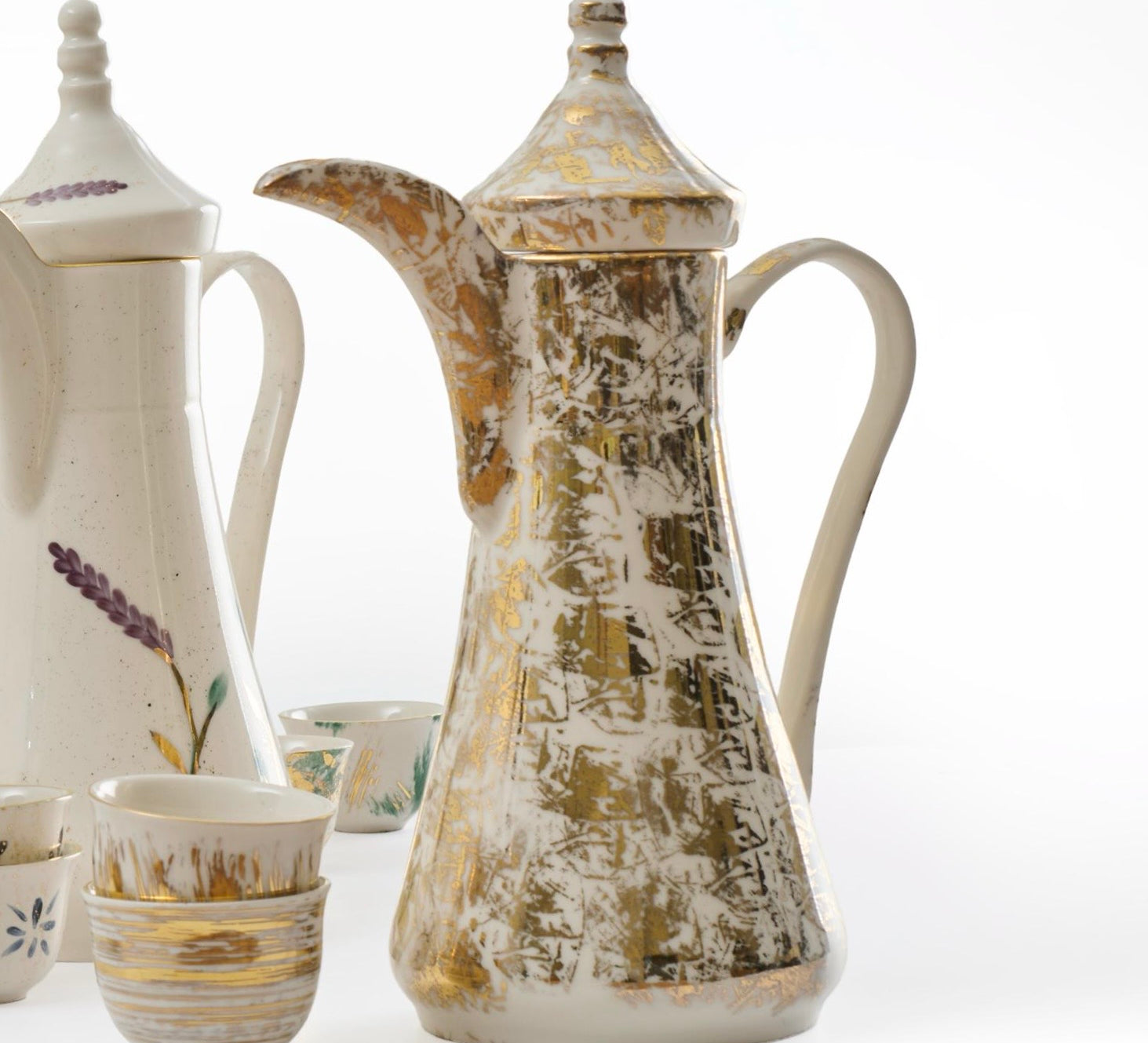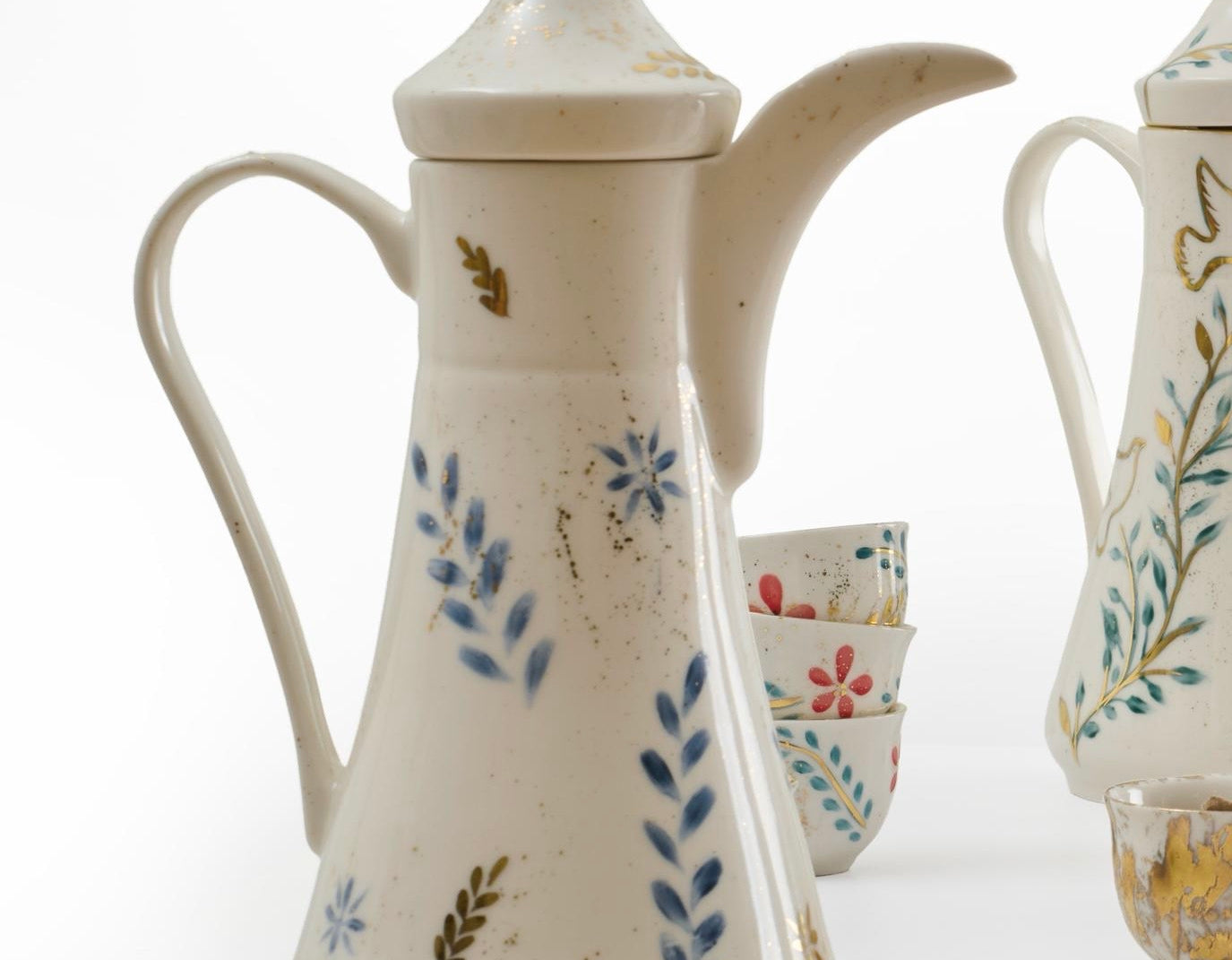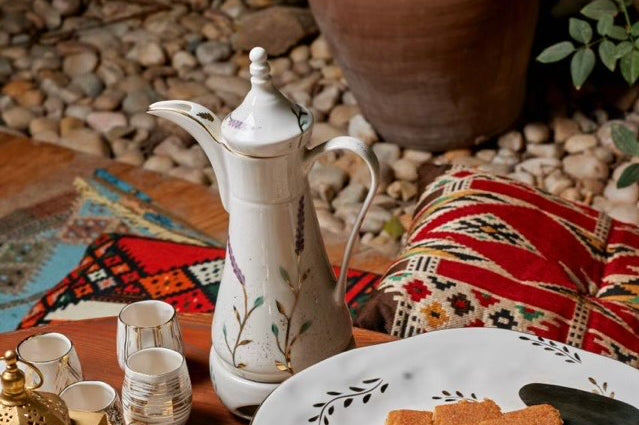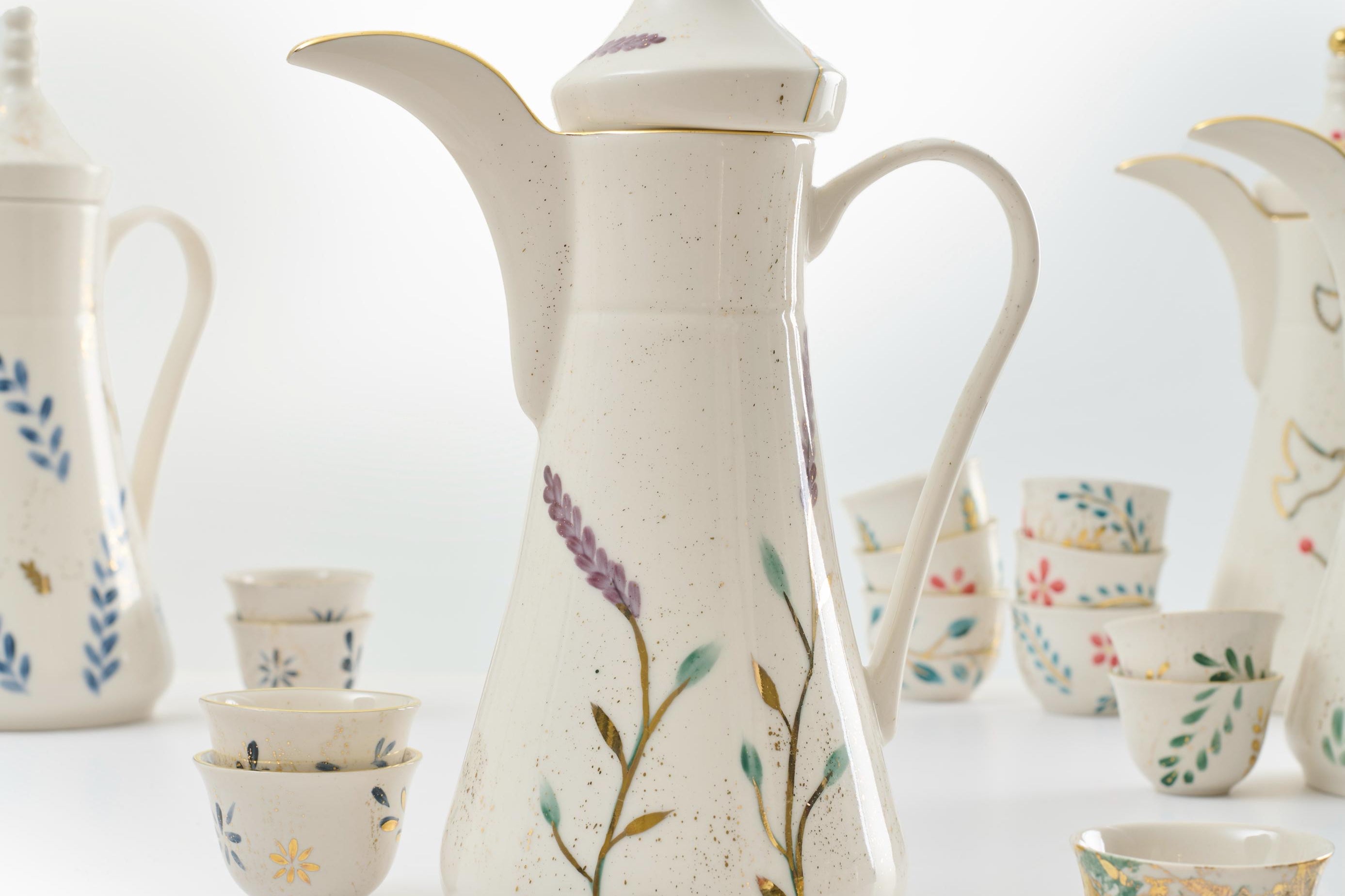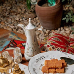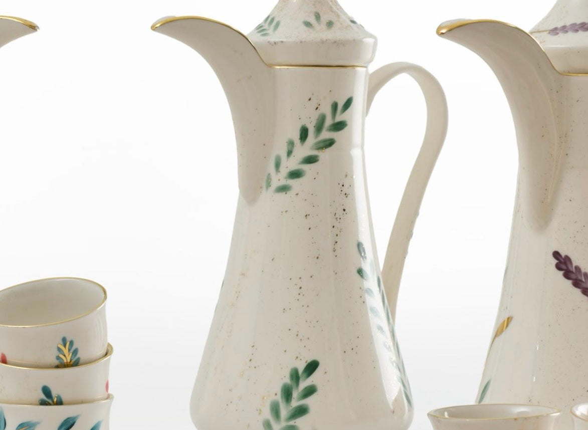 Designed for the ritual of Arabic coffee, the Qahwa dallah is hand painted with delicate detailing that catches light softly. Crafted from fine porcelain and kiln-fired for durability, it is made for both everyday hospitality and special gatherings.