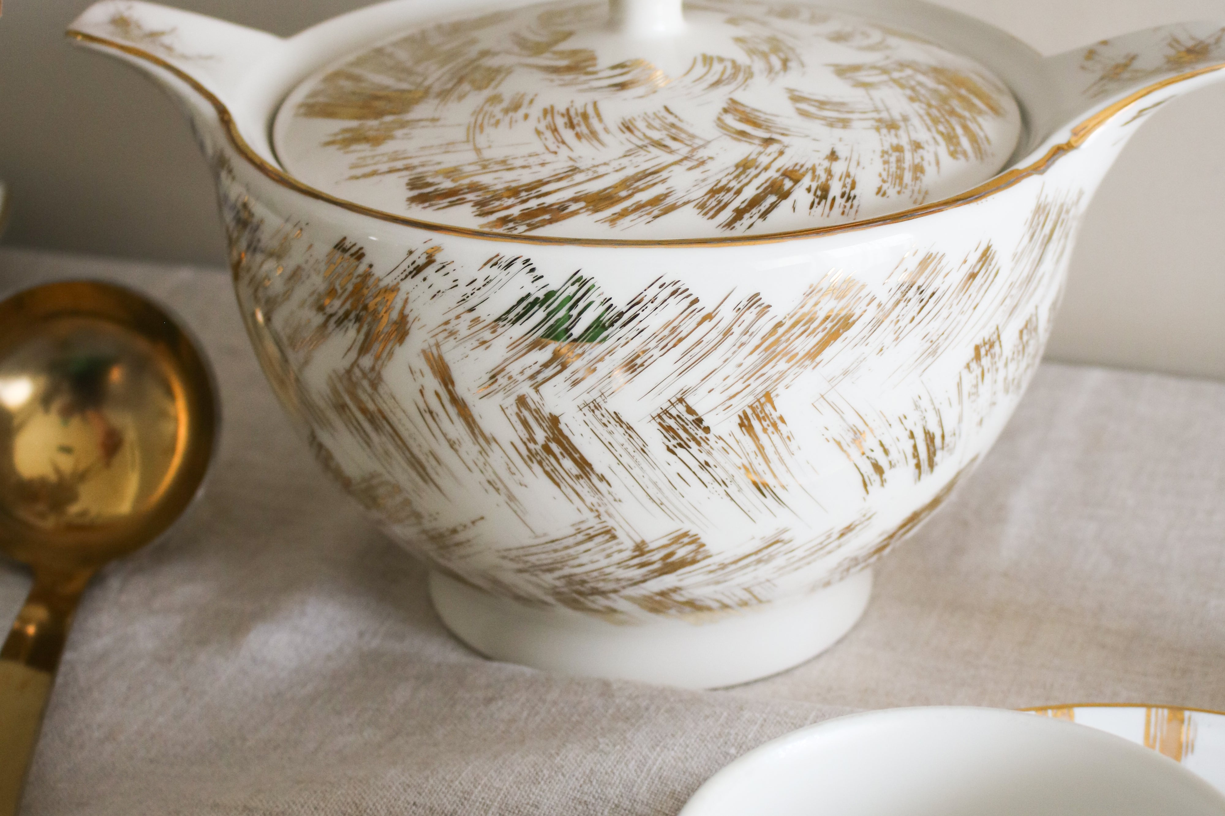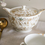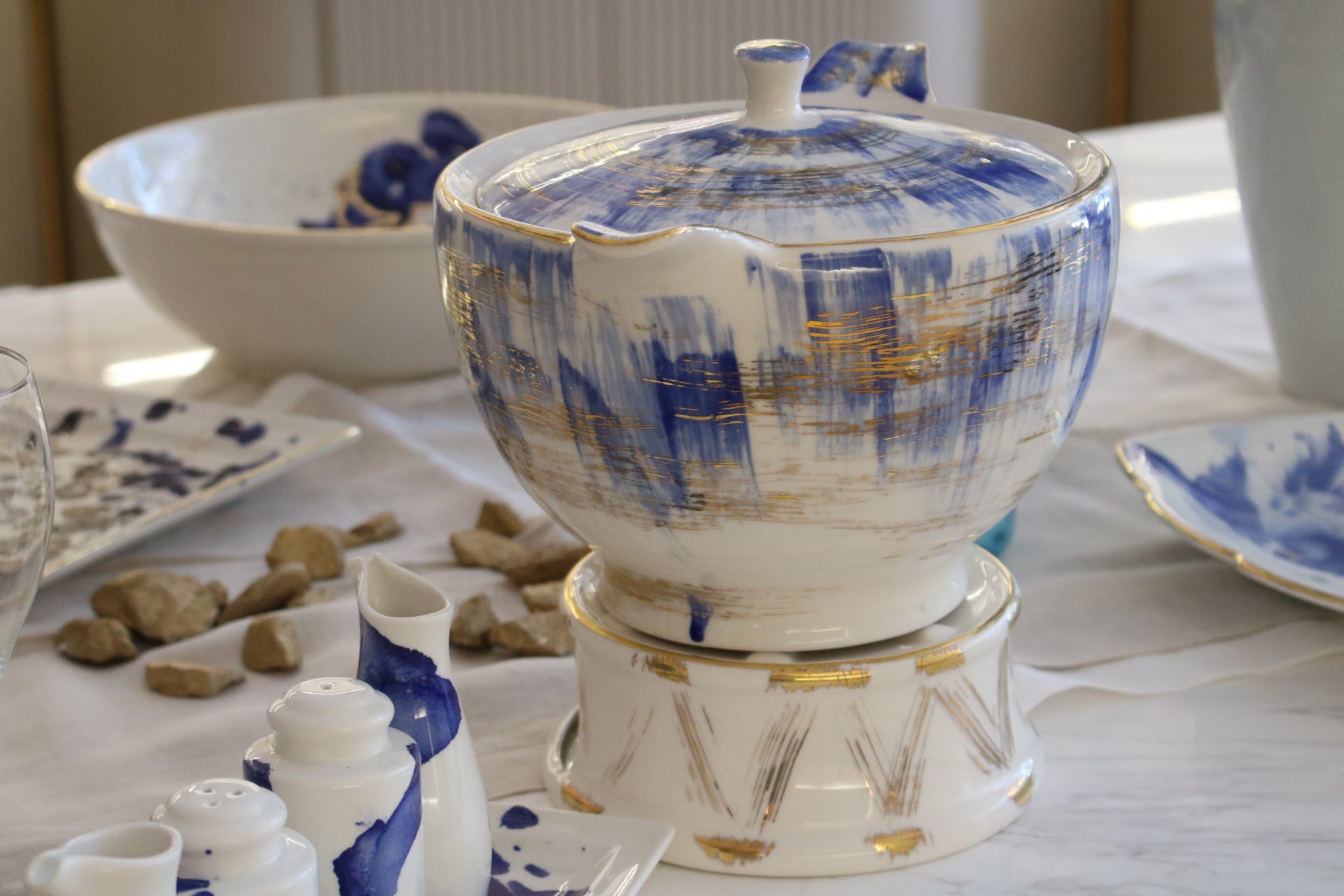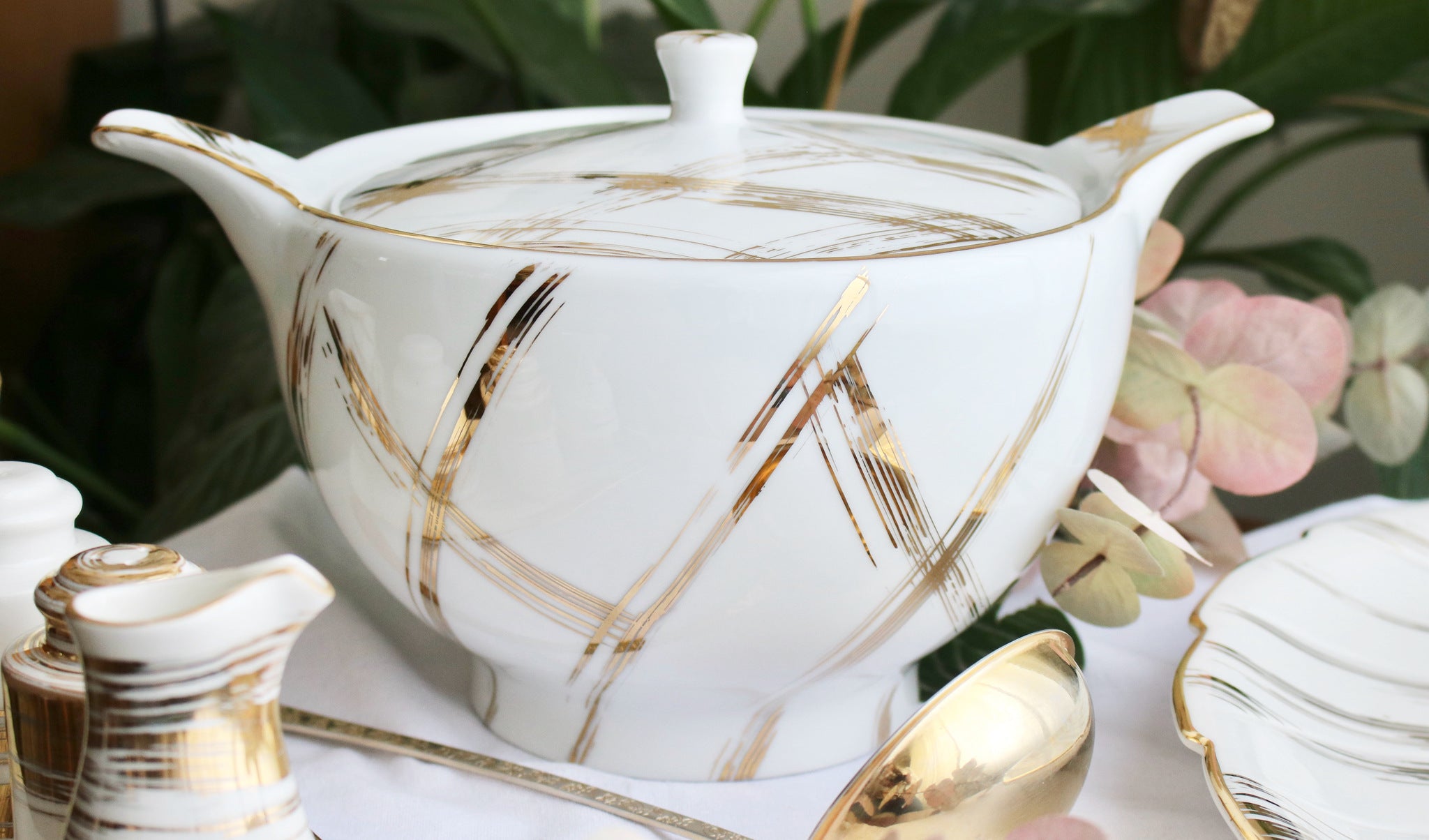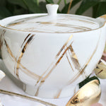 Elegantly designed and locally produced, this 1.5 liter soup tureen adds an extra spark to any table setting. This is pure gold hand painted on porcelain.