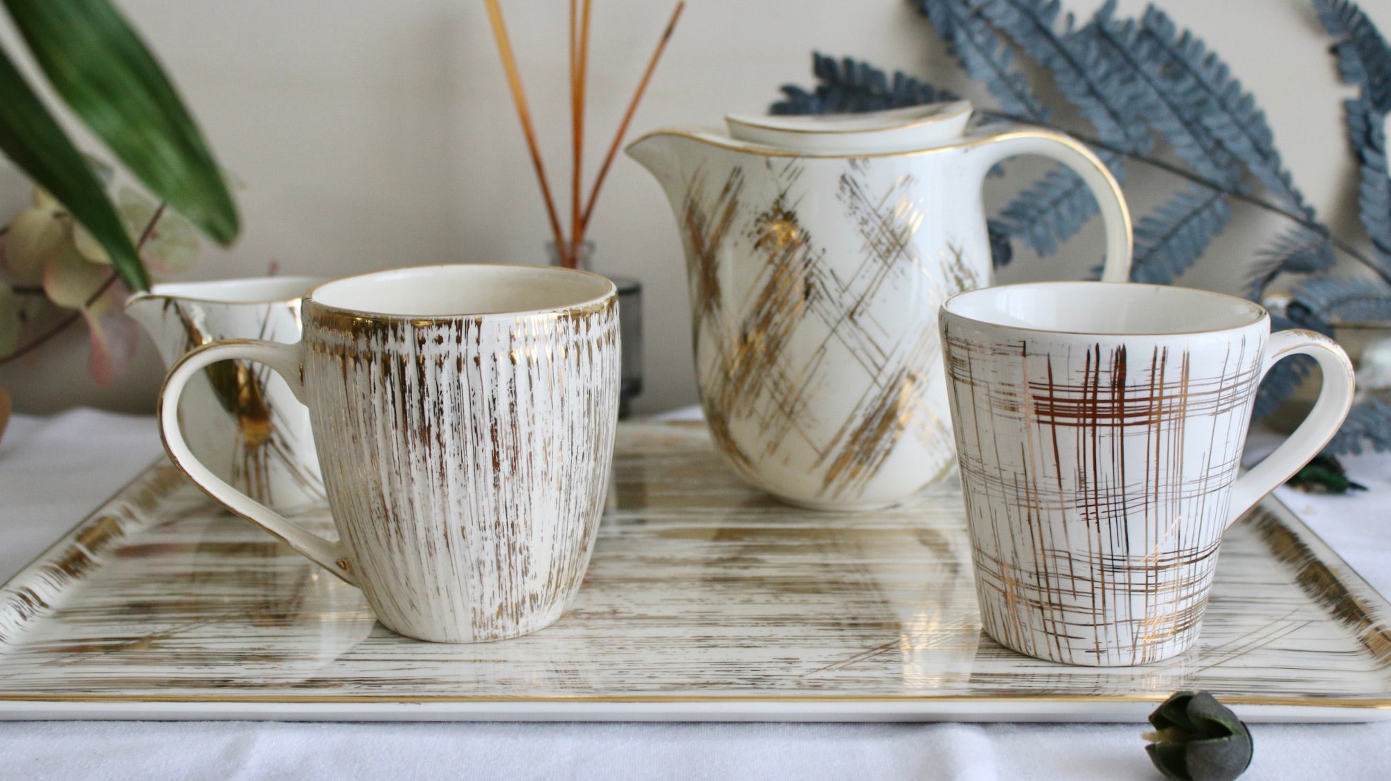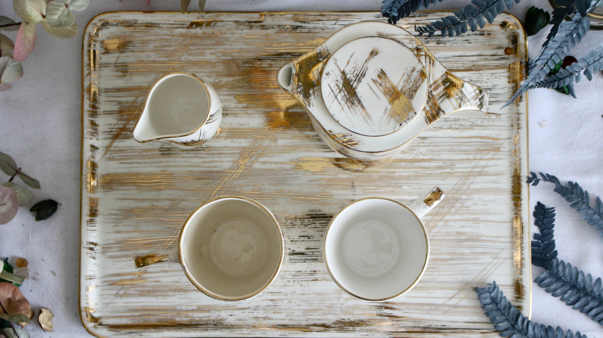 Perfectly sized for the dining table, coffee nook, and everything in between, the Dita tray is 41x30 centimeters. This is pure gold hand painted on porcelain.