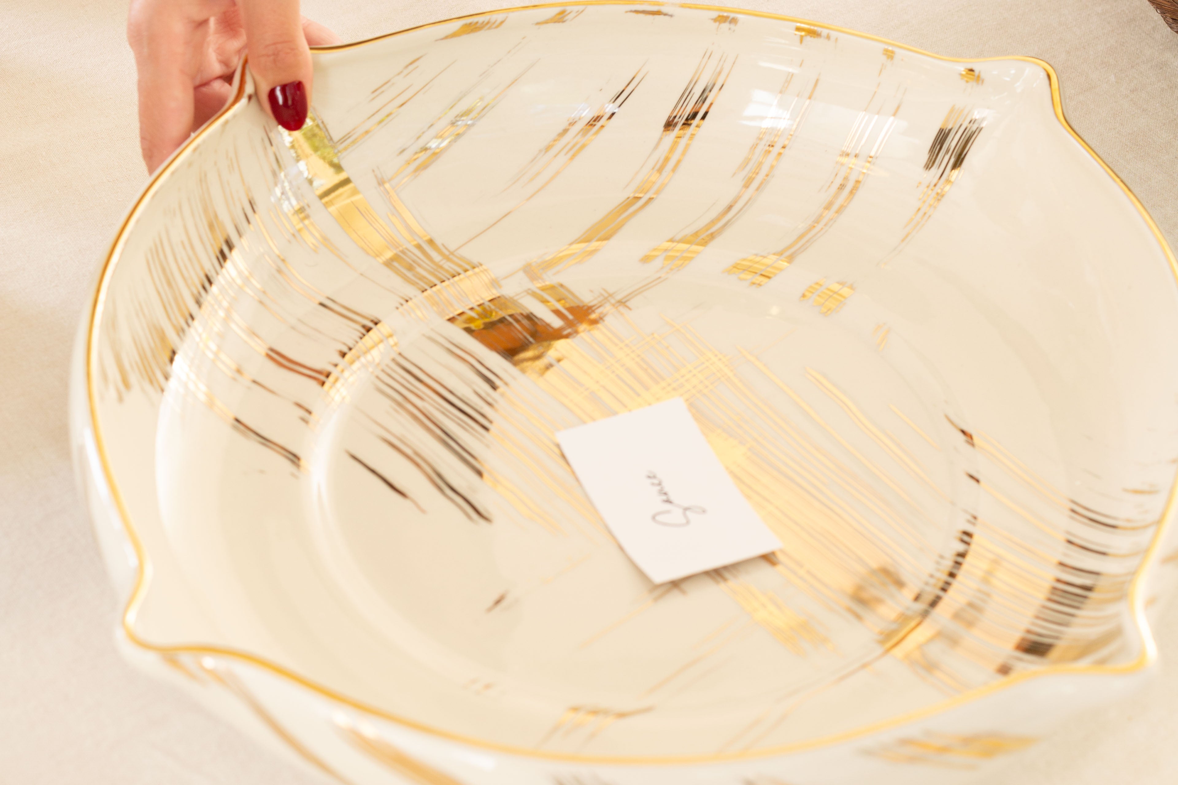 This is pure gold hand painted on porcelain. This salad bowl is non-microwaveable, but is dishwasher safe up to 500 cycles. It's also oven safe.