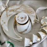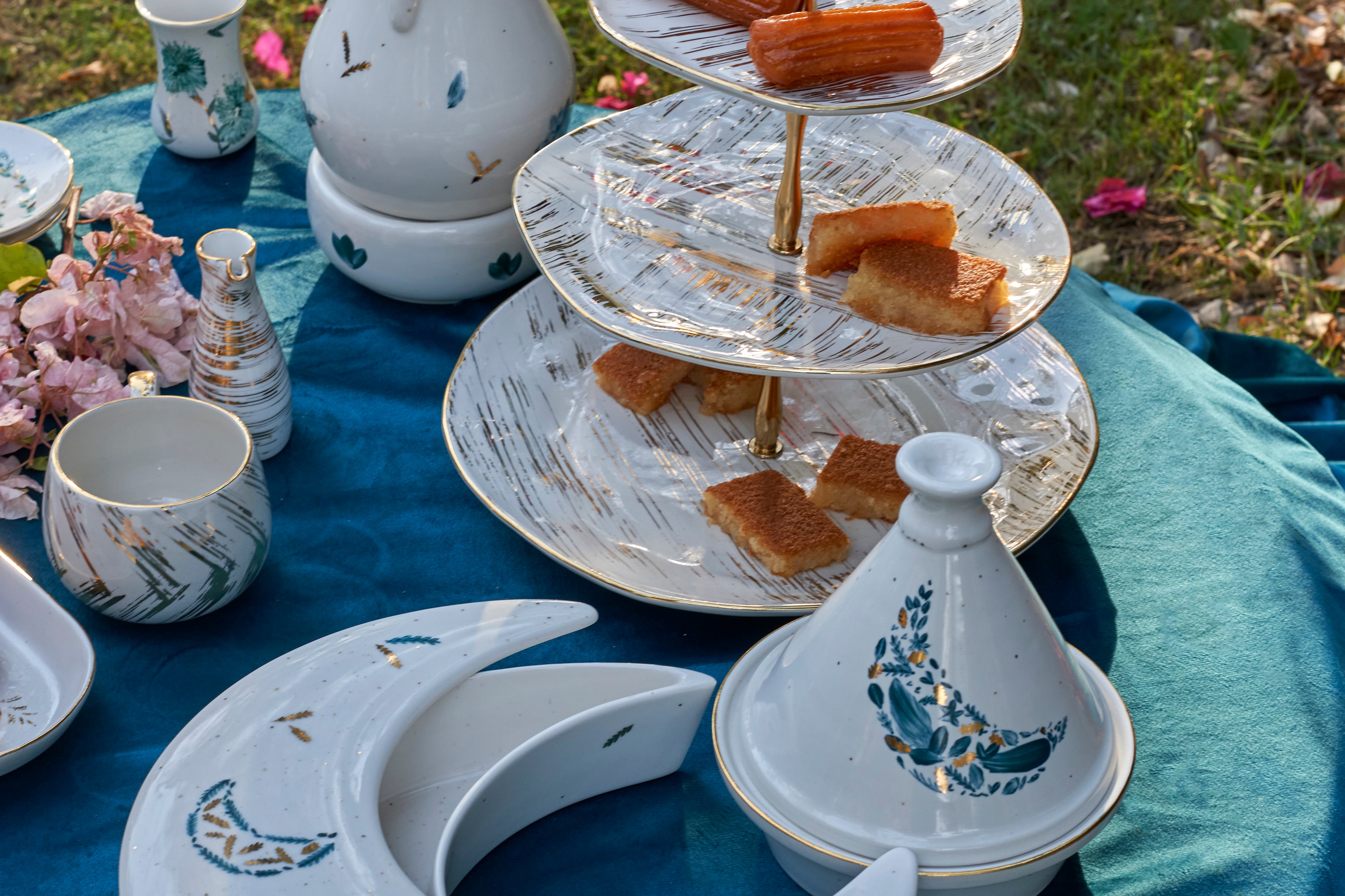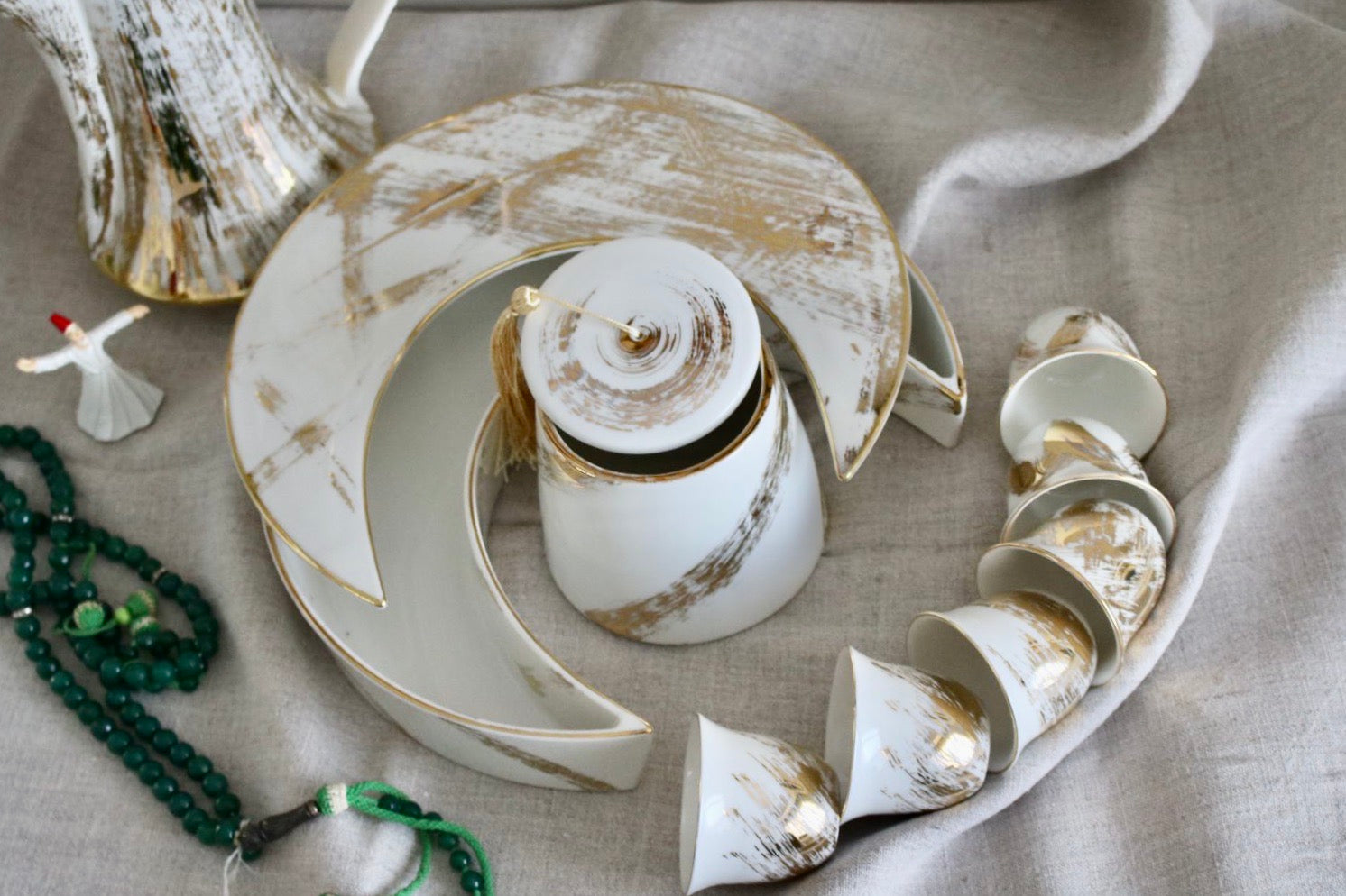 Fayrouz, a beautiful addition to our Ramadan setup. We love using ours as a serving piece on the dining table, or next to our tamr and Arabic coffee cups. This is pure gold hand painted on porcelain.