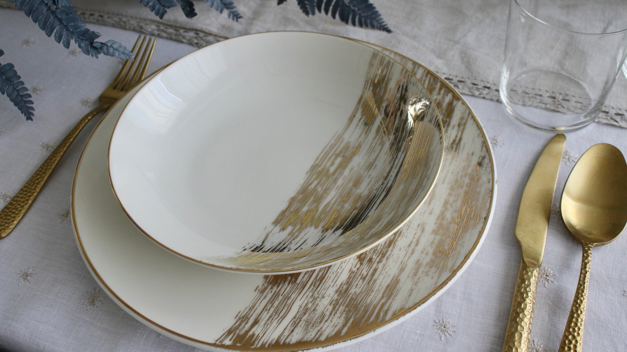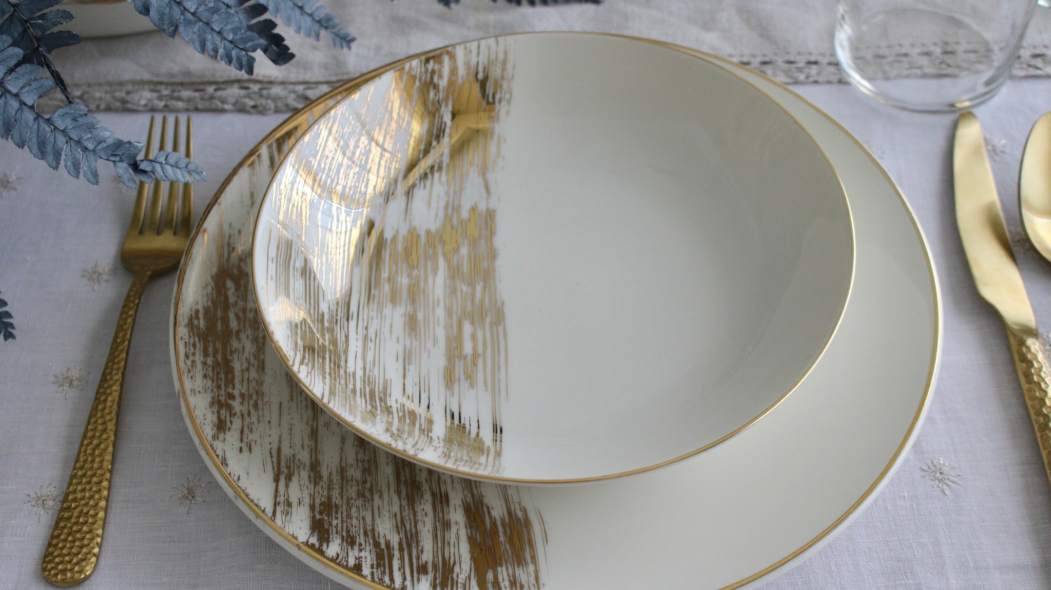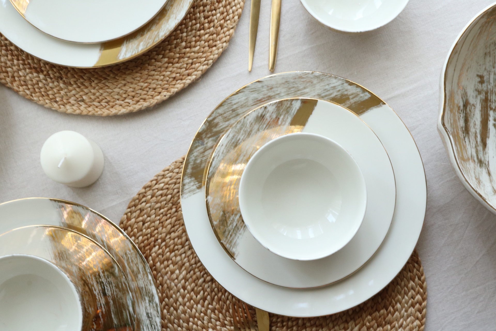 Our timeless Half Brush Aurum set, for those who love the best of worlds! This is pure gold hand painted on porcelain.