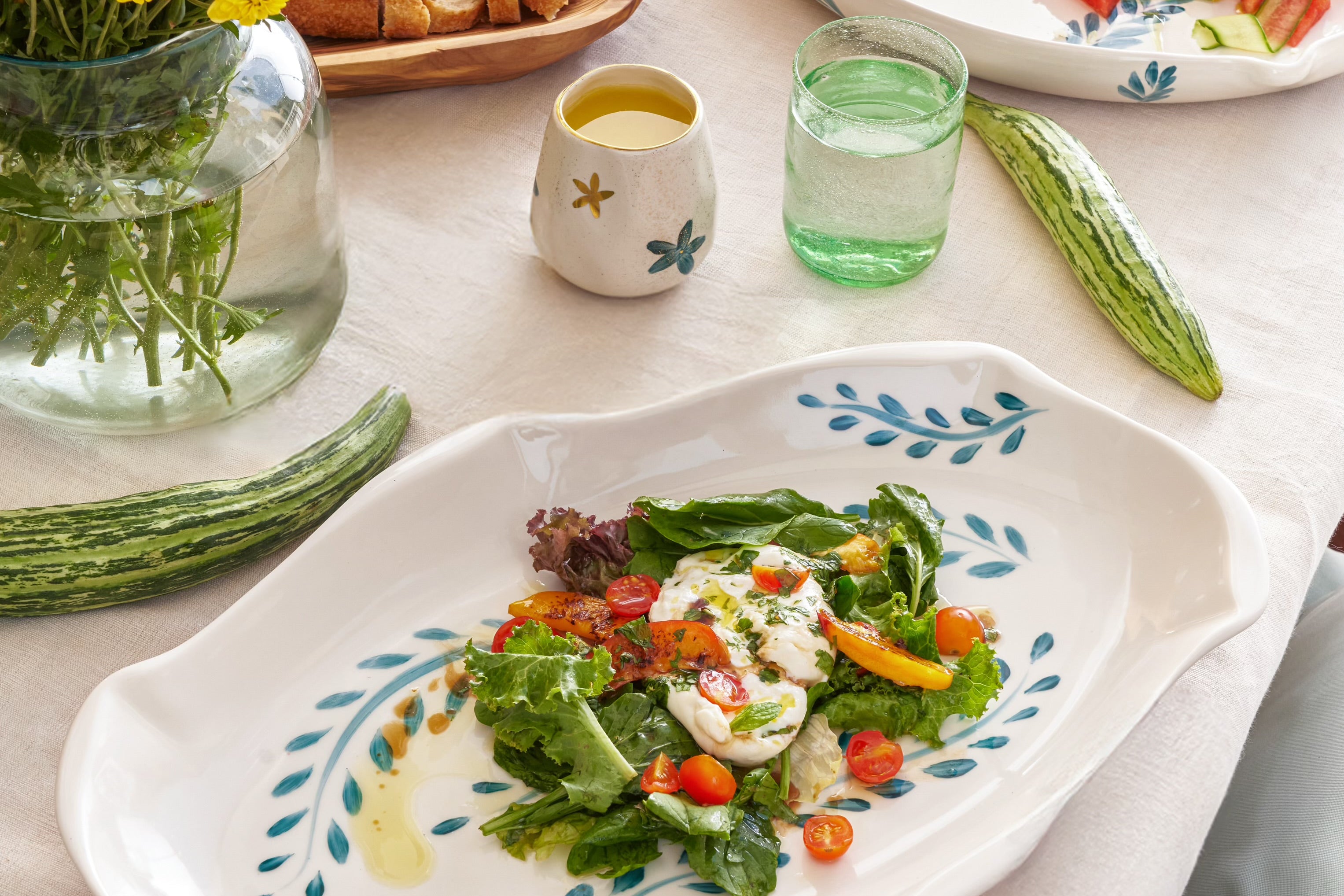 Hand-painted with leafy blue motifs, this porcelain platter is made for sharing. Its shape makes it perfect for grilled corn, fresh salads, or family-style mains, while the subtle curves lend a touch of softness to your table. Both functional and decorative, it’s a piece that works just as beautifully for everyday dinners as it does for entertaining.