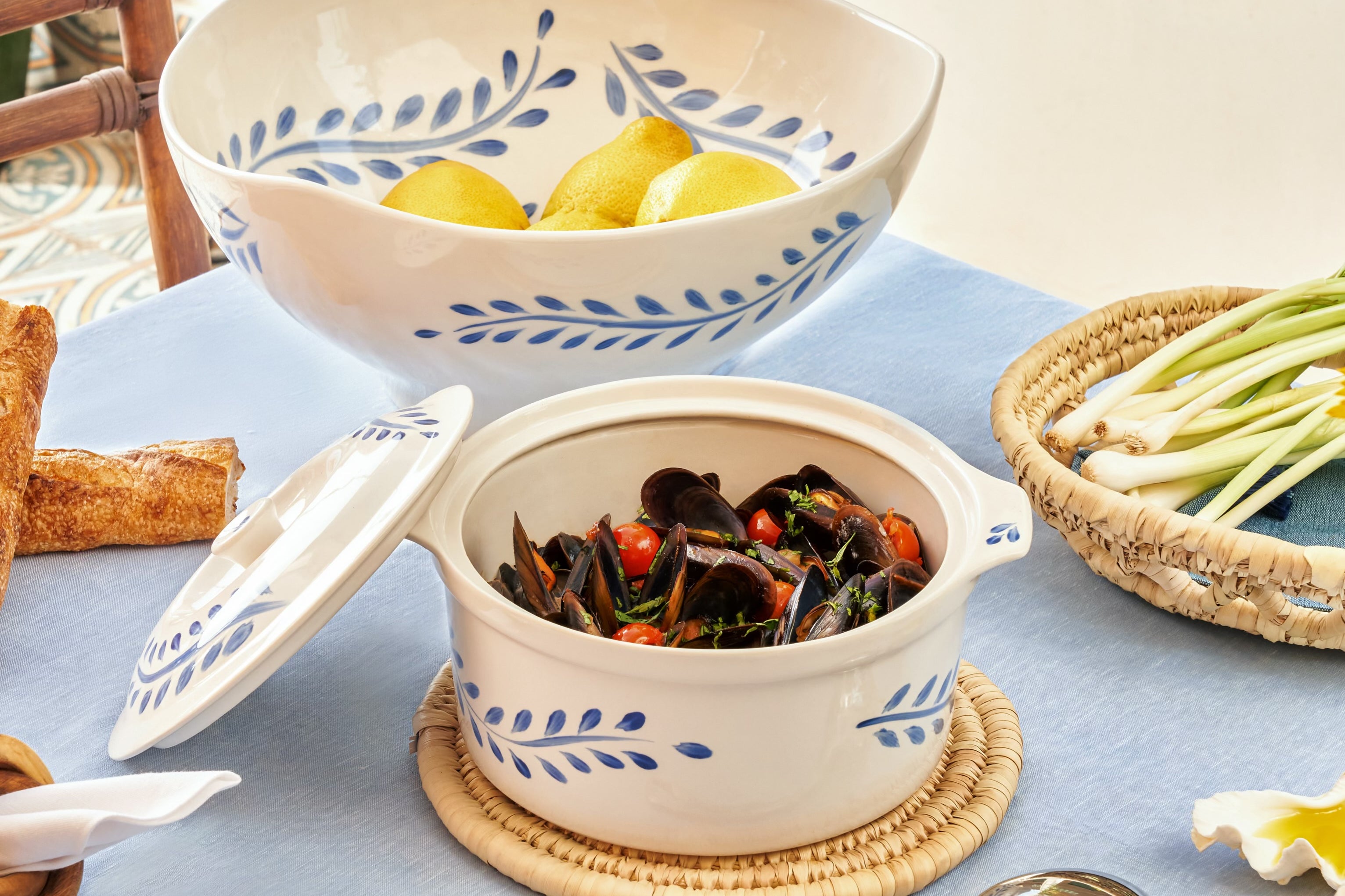 Simple and timeless, this lidded porcelain soup pot is finished with hand-painted blue leaves. Designed to go from oven to table, it’s just right for hearty stews, pastas, or fresh mussels. A piece that feels both everyday and special.