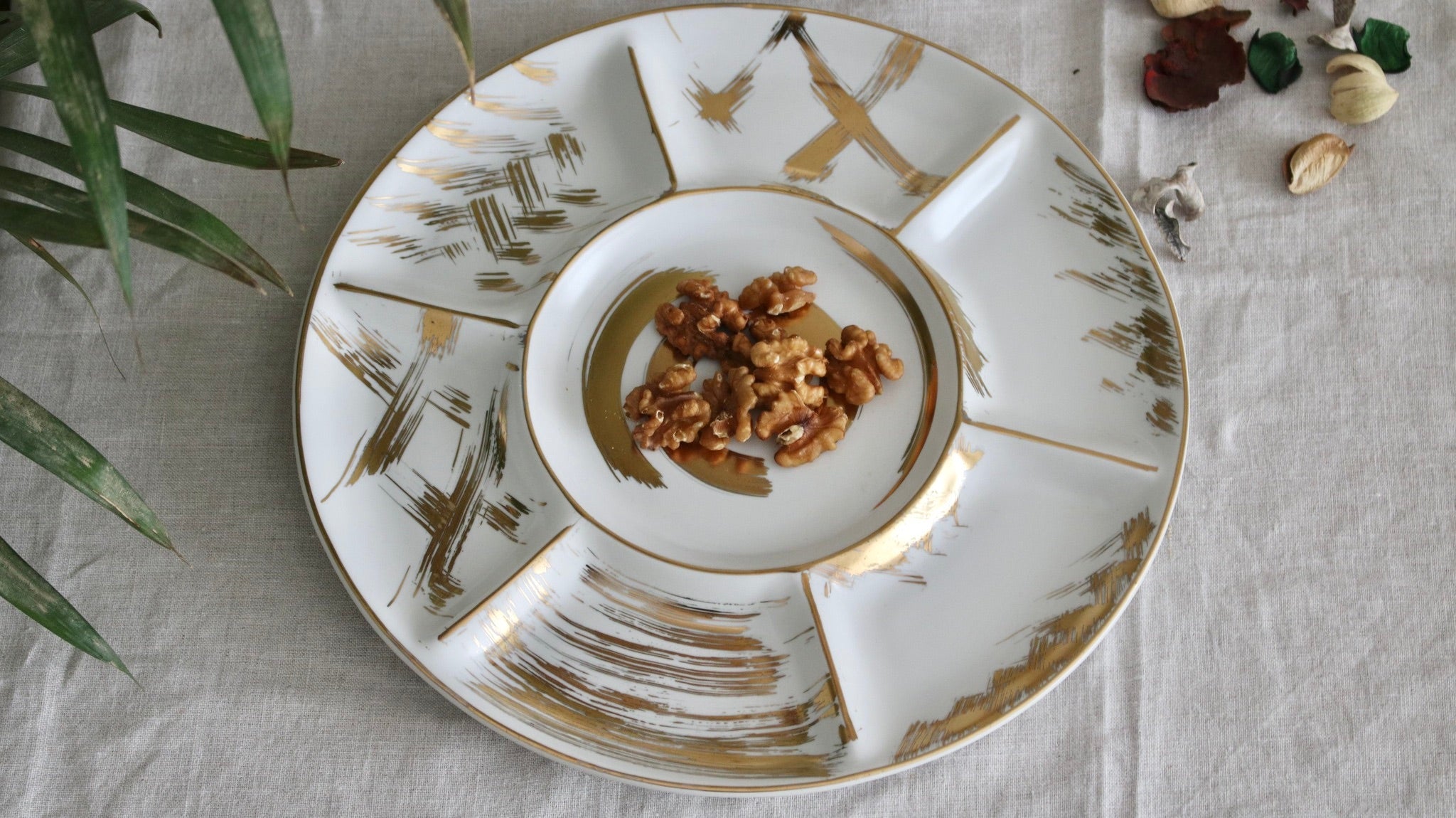 Game night staple! The 30 centimeter Suki platter is for those who want a little bit of everything, which is why it's one of our favorites. This is pure gold hand painted on matte porcelain. This platter is non-microwaveable but is dishwasher safe for up to 500 cycles. It is also oven safe.