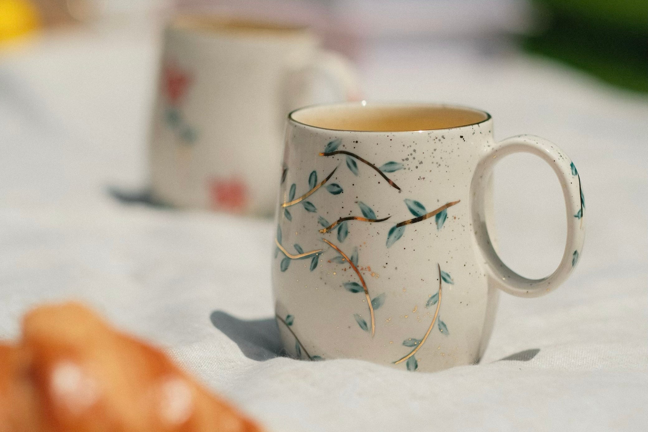 This is pure gold hand painted on porcelain. The Morning Bloom mug is non-microwaveable but is dishwasher safe for up to 500 cycles. It is also oven safe.