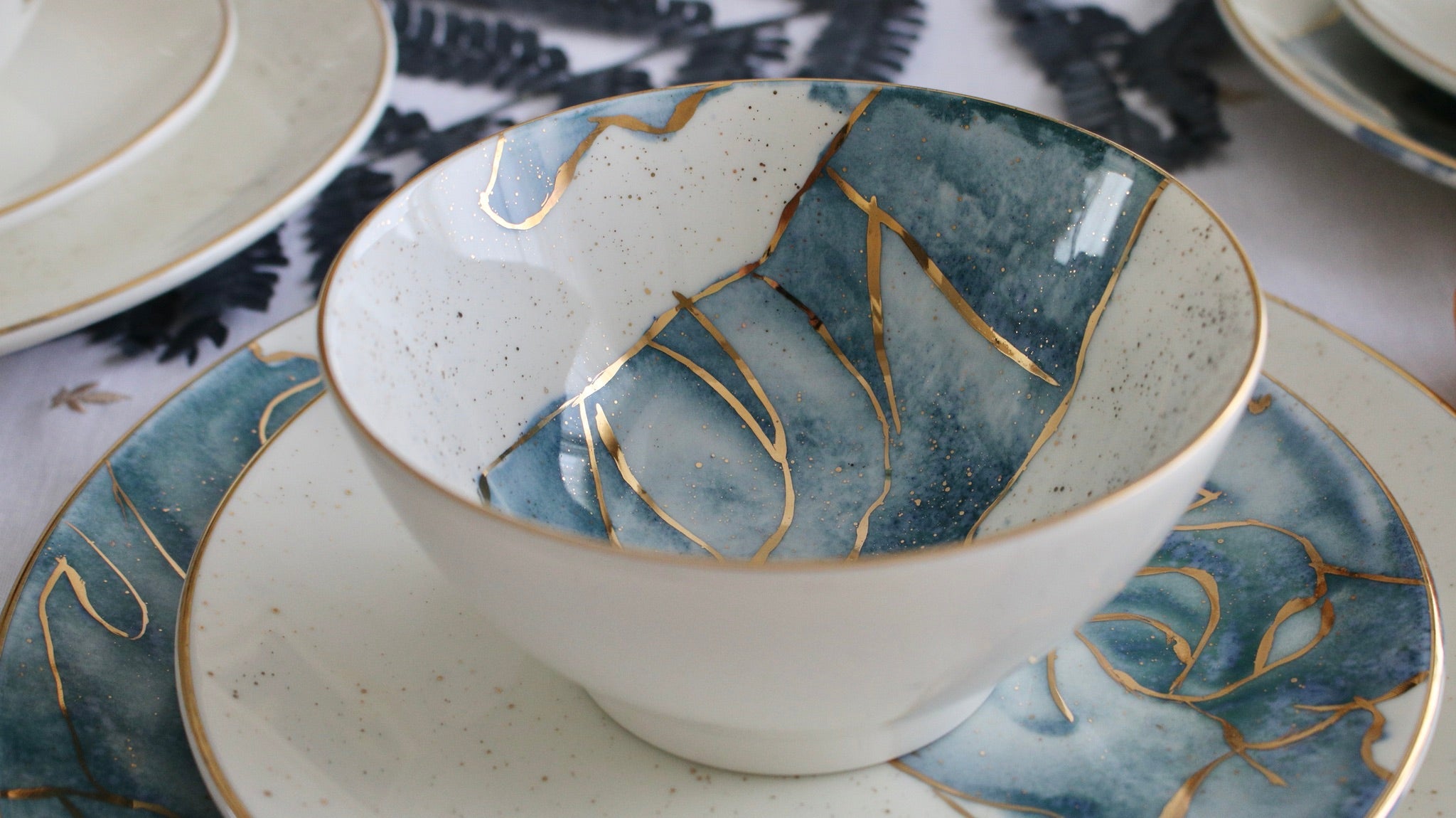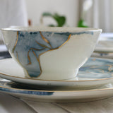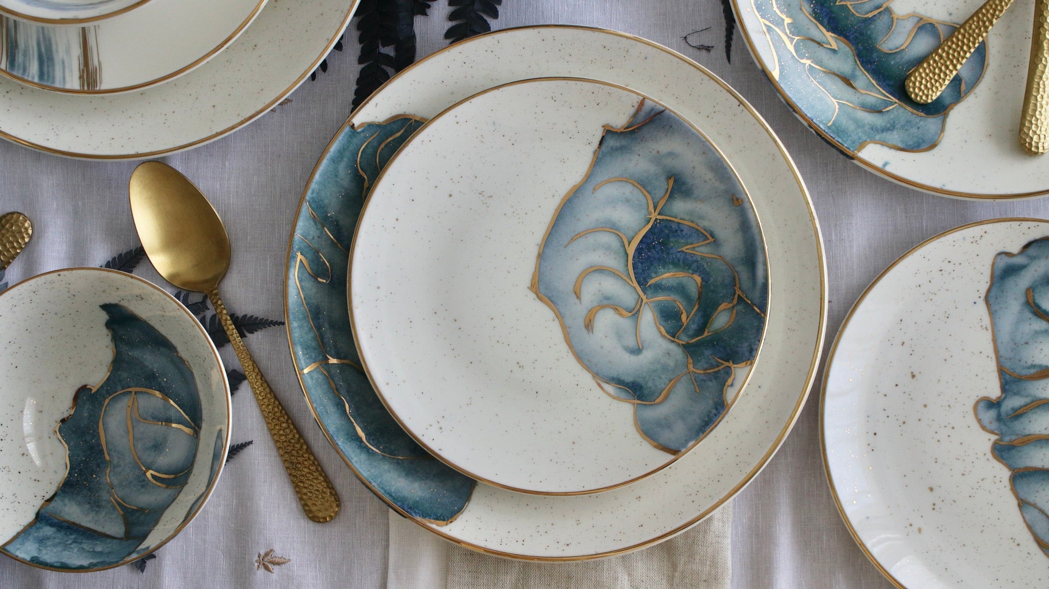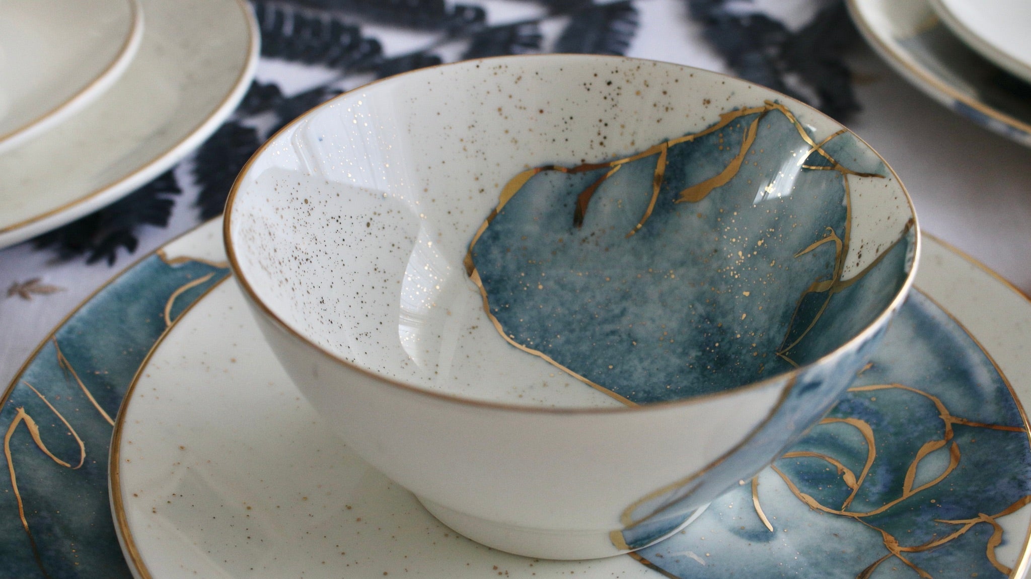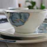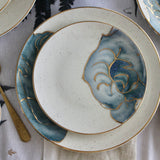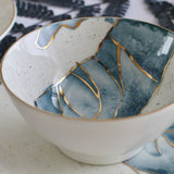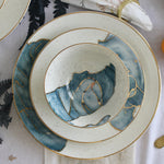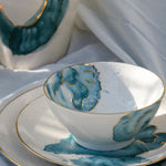 A set encapsulating the essence of watercolors. Our favorite set to date, it speaks for itself. This is pure gold hand painted on porcelain. Since this is hand painted porcleain, no two pieces are identical!