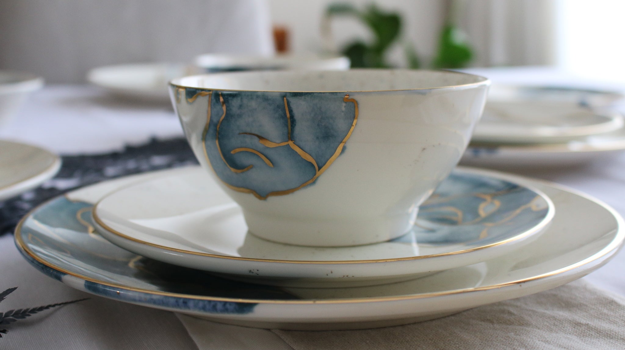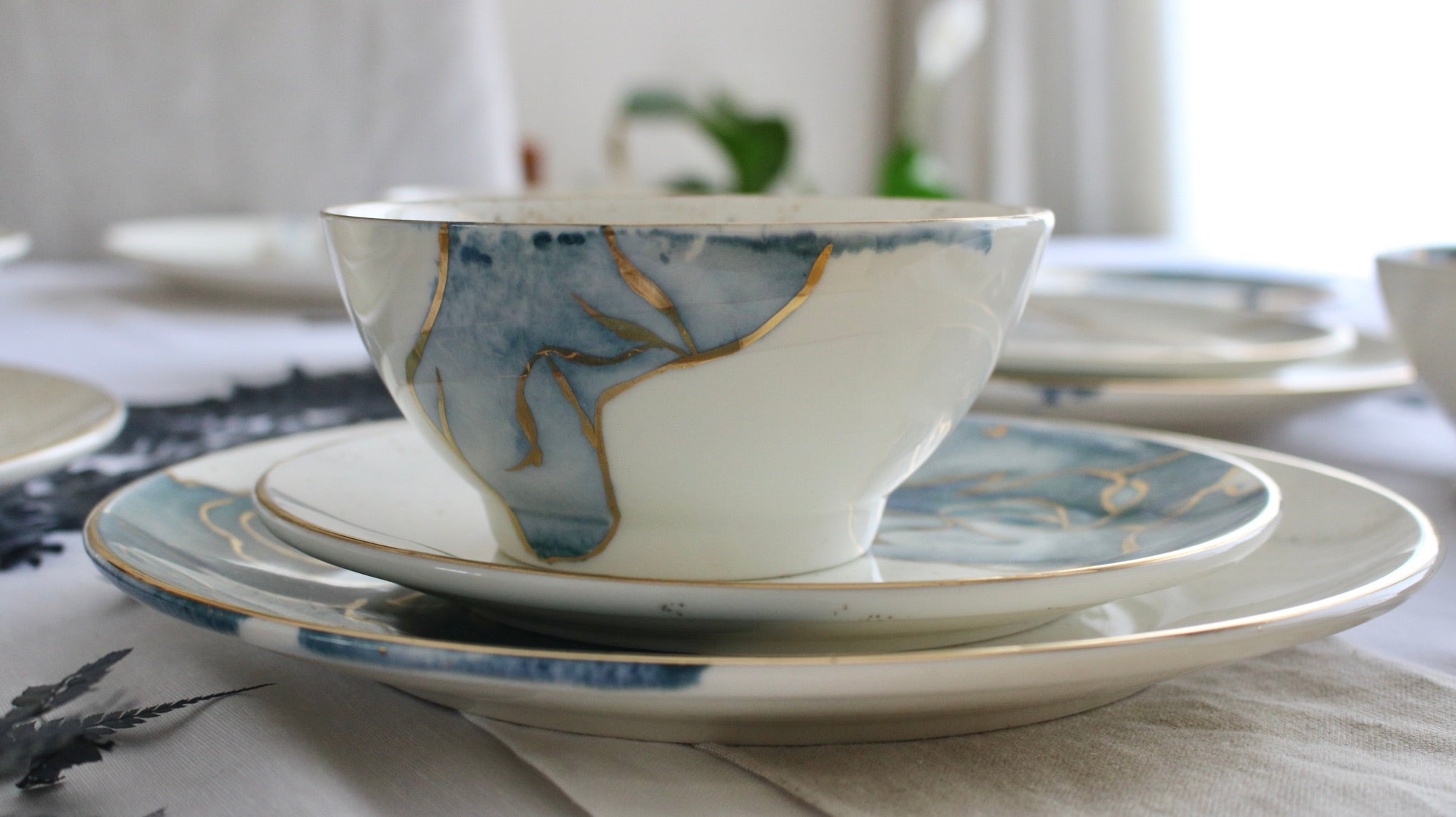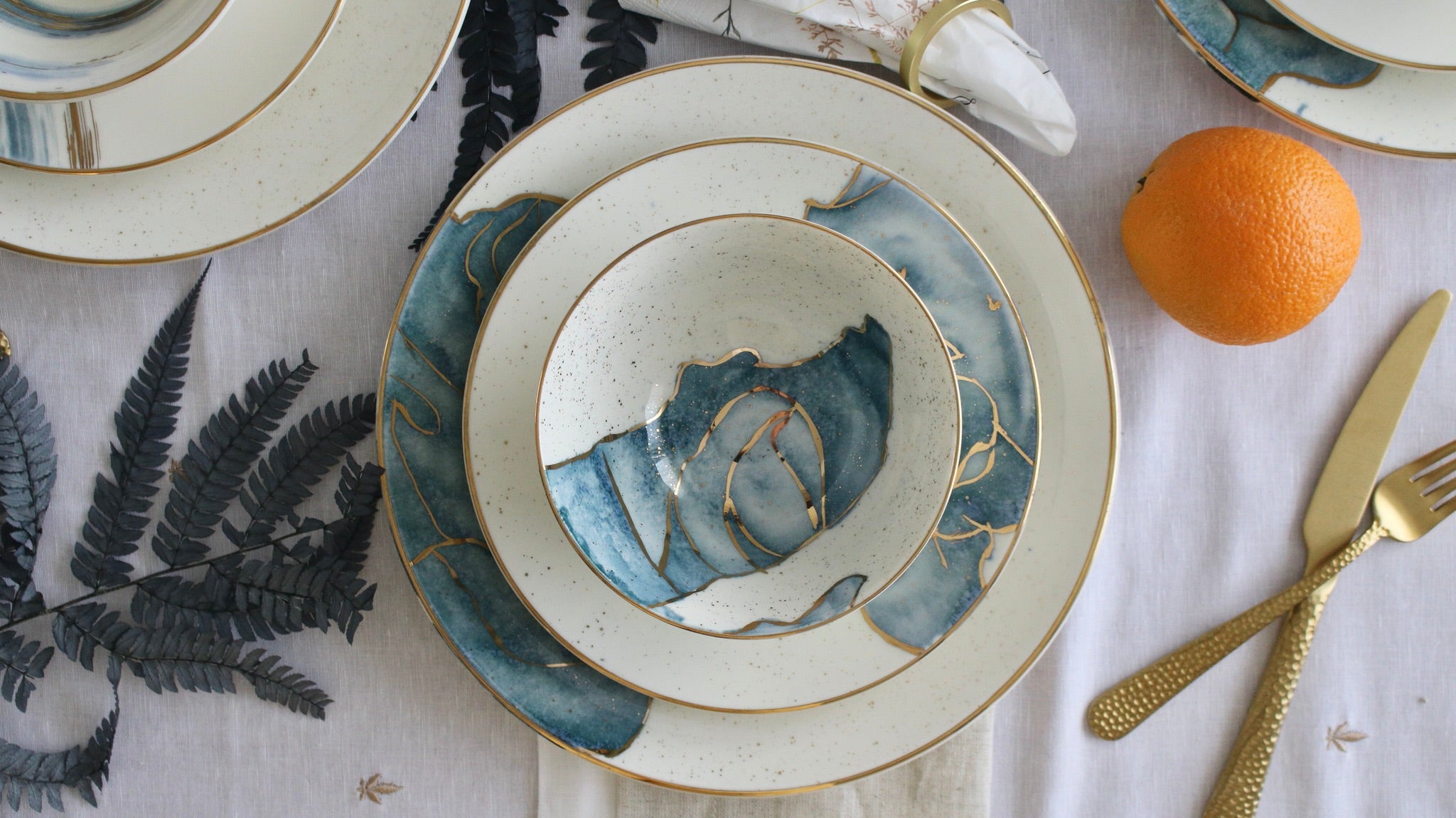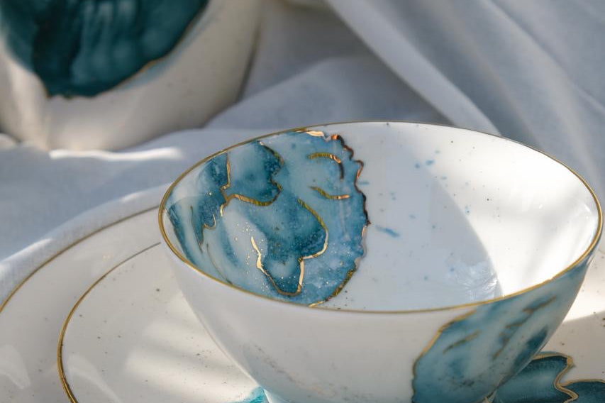 A set encapsulating the essence of watercolors. Our favorite set to date, it speaks for itself. This is pure gold hand painted on porcelain. Since this is hand painted porcleain, no two pieces are identical!