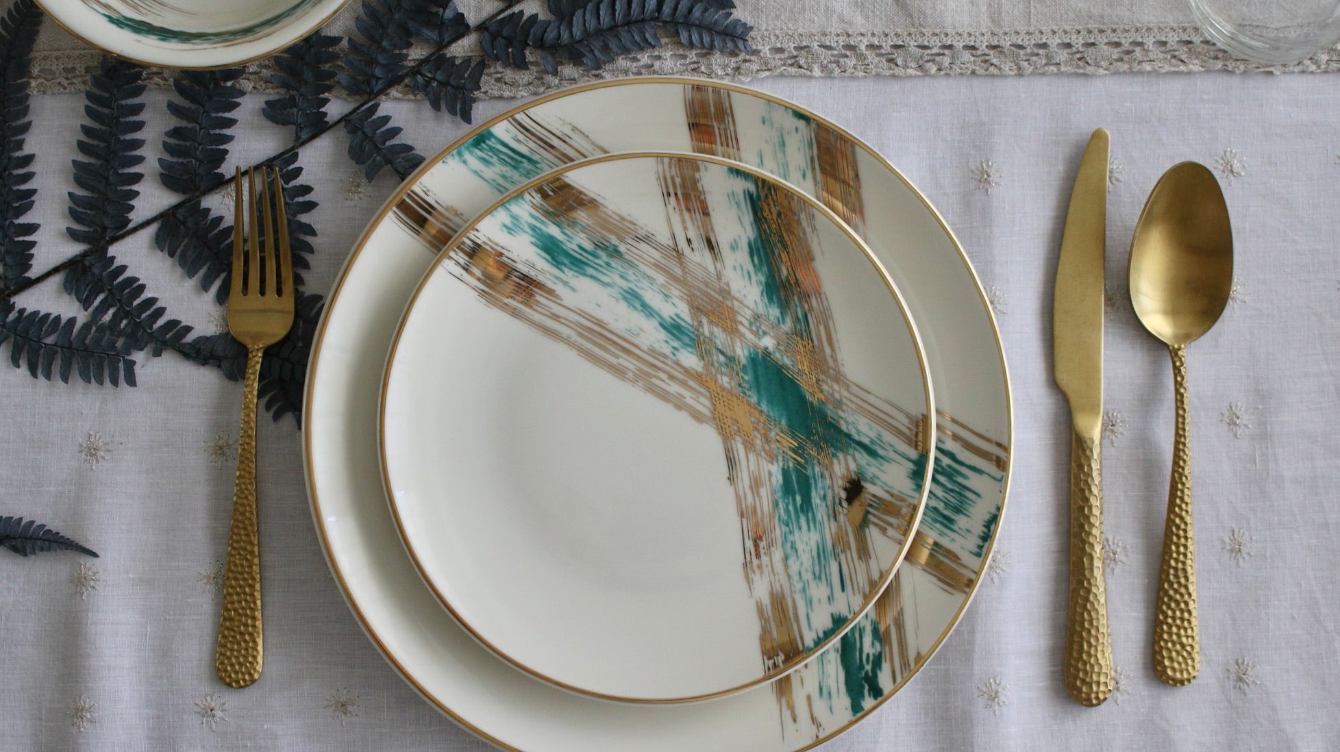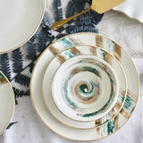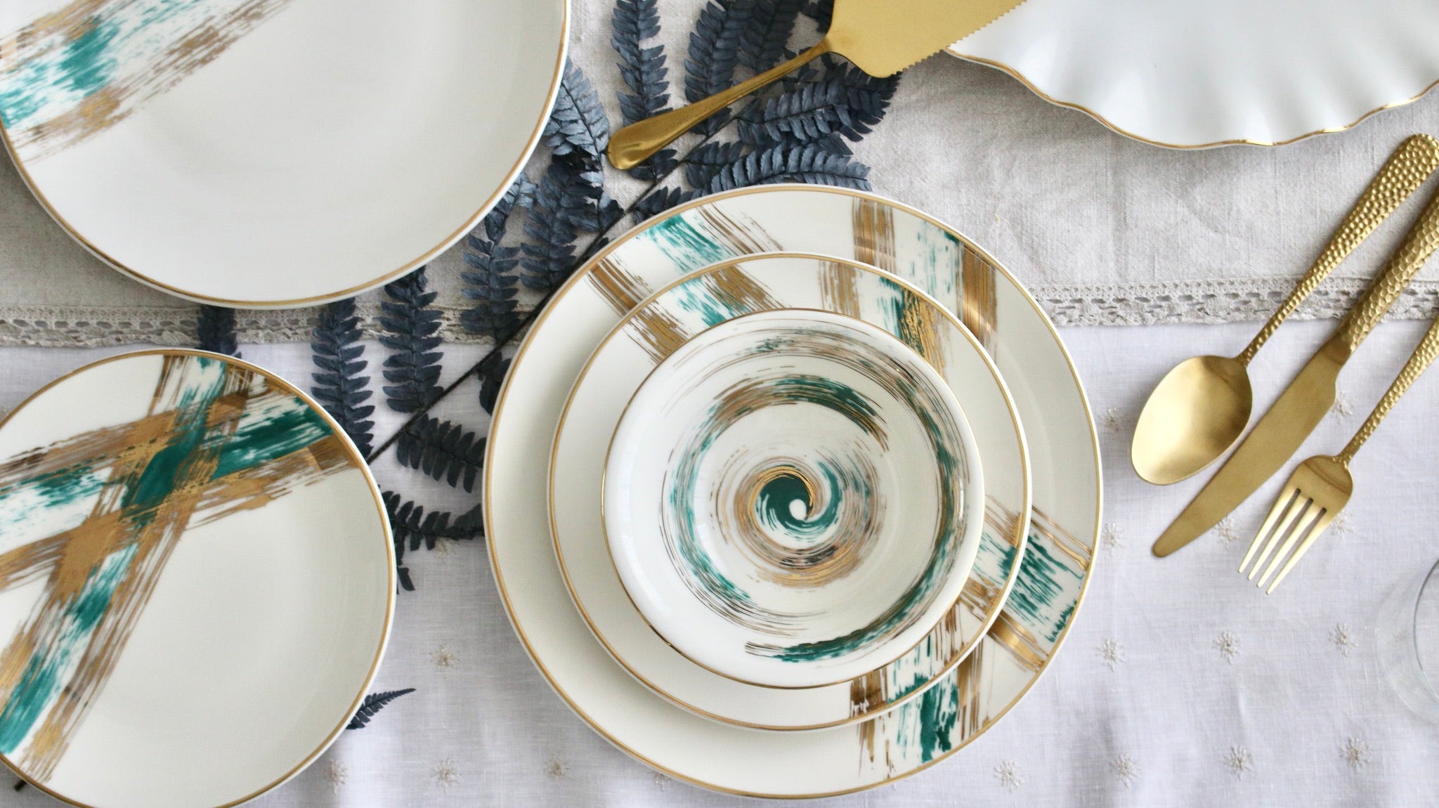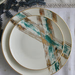 Inspired by architecture and the world around us, The XO set brings a side of color to the table. This is pure gold hand painted on porcelain.